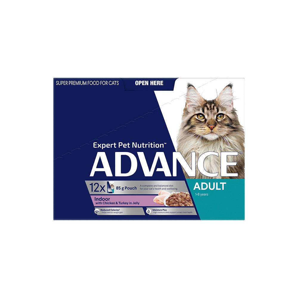 ADVANCE Chicken & Turkey Jelly Wet Cat Food for Adult Indoor Cat 85gx12 is a super premium, Australian made food that is complete and balanced to support the health and wellbeing of your feline friend, with added nutrients to help support a strong immune system. Made with high-quality ingredients, perfect for cats who love a good jelly consistency. Plus, it has a lower-calorie level and lean proteins to help keep them healthy and fit.