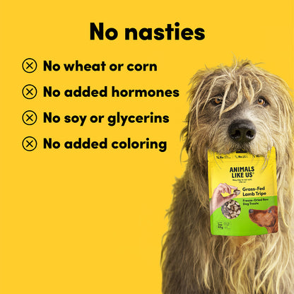Animals Like Us Freeze-Dried Treats are a treat food suitable for all breeds and lifestages. Intended for intermittent or supplemental feeding only.