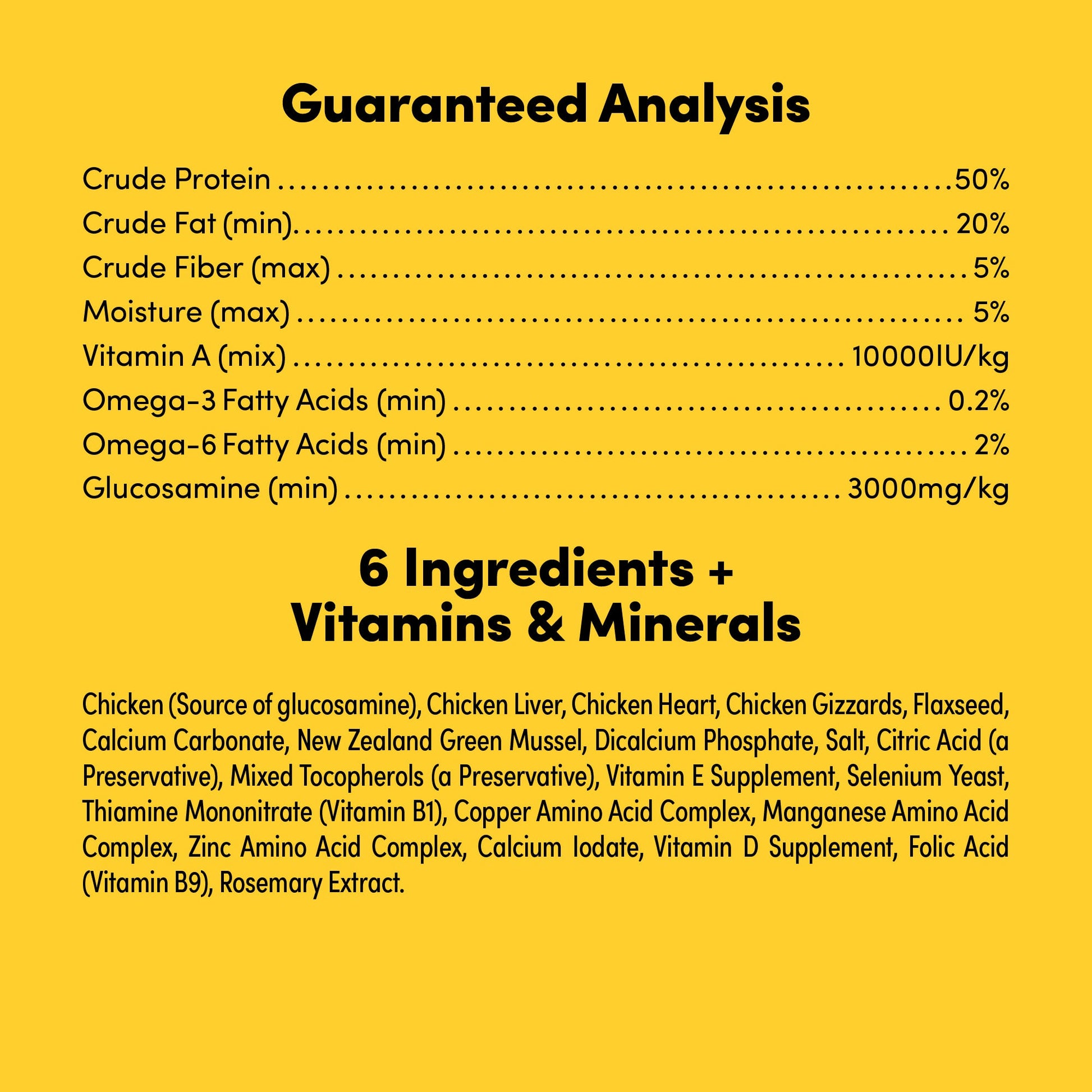 Lamb (Source of Glucosamine), Lamb Liver, Lamb Lung, Lamb Tripe, Flaxseed, New Zealand Green Mussel, Calcium Carbonate, Salt, Citric Acid (Preservative), Mixed Tocopherols (Preservative), Dicalcium Phosphate, Vitamin E Supplement, Selenium Yeast, Thiamine Mononitrate (Vitamin B1), Manganese Amino Acid Complex, Zinc Amino Acid Complex, Calcium Iodate, Vitamin D Supplement, Folic Acid (Vitamin B9), Rosemary Extract.