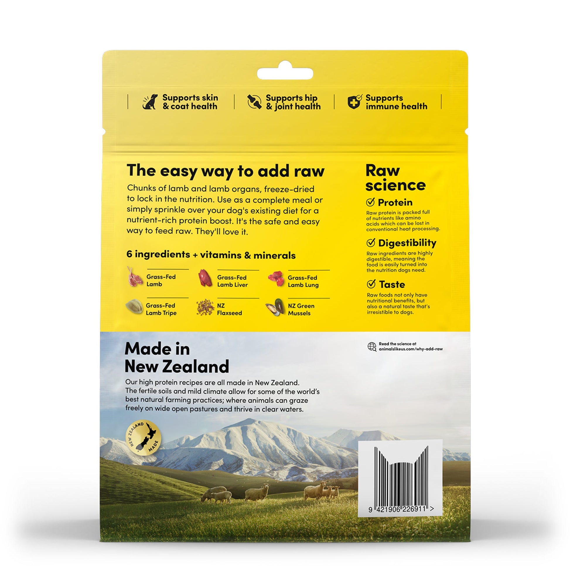 Using a gentle freeze-drying process, the natural goodness of raw lamb is preserved — locking in essential nutrients and flavour without the need to handle raw meat. Serve as a complete meal or mix with your dog’s regular food for an easy, convenient way to add raw nutrition.