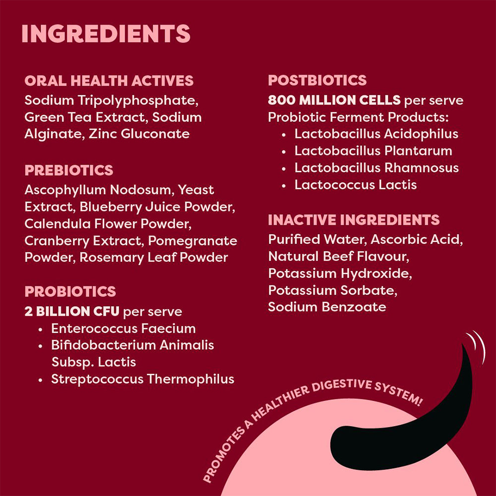Bell & Bone’s Dental Topper combines oral actives and our unique powerful tribiotic blend (prebiotics, probiotics and postbiotics) to fight dental disease at the root cause—the gut, by turning your dog's favourite meal into dental food in just 4 sprays daily.