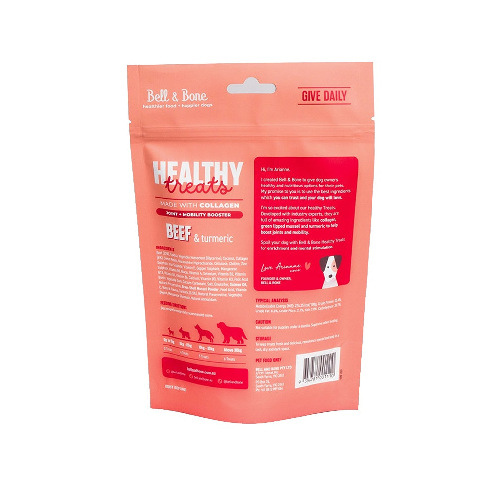 Beef & Turmeric are expertly crafted to support joint health and mobility in dogs. Formulated with premium collagen, they help maintain collagen levels for healthier tendons, muscles, and ligaments, promoting better joint function and reducing the risk of osteo diseases. With the highest quality ingredients, including turmeric, these treats support your dog's ability to fetch and play like a puppy for years to come. Choose treats that prioritize your pet's well-being and feel confident in your choice as a pet owner.