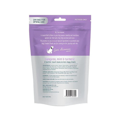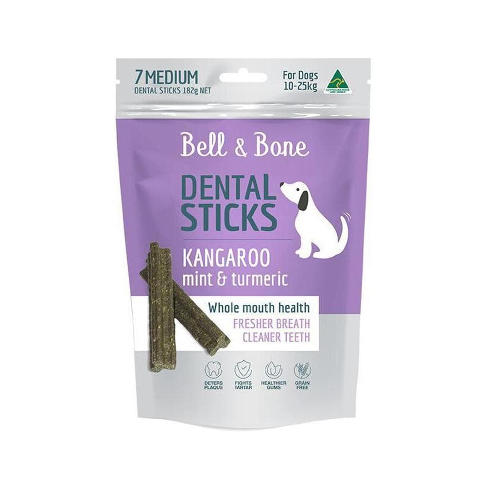 BELL & BONE Kangaroo, Mint & Turmeric Dental Stick Dog Treats 182g (medium) is an excellent source of Zinc to boost your pup's energy. The versatility in both function and flavour means they can help to reduce plaque accumulation on your puppy's teeth whilst facilitating healthier, stronger teeth. Featuring premium kangaroo meat which is high in iron that strengthens their immune systems.