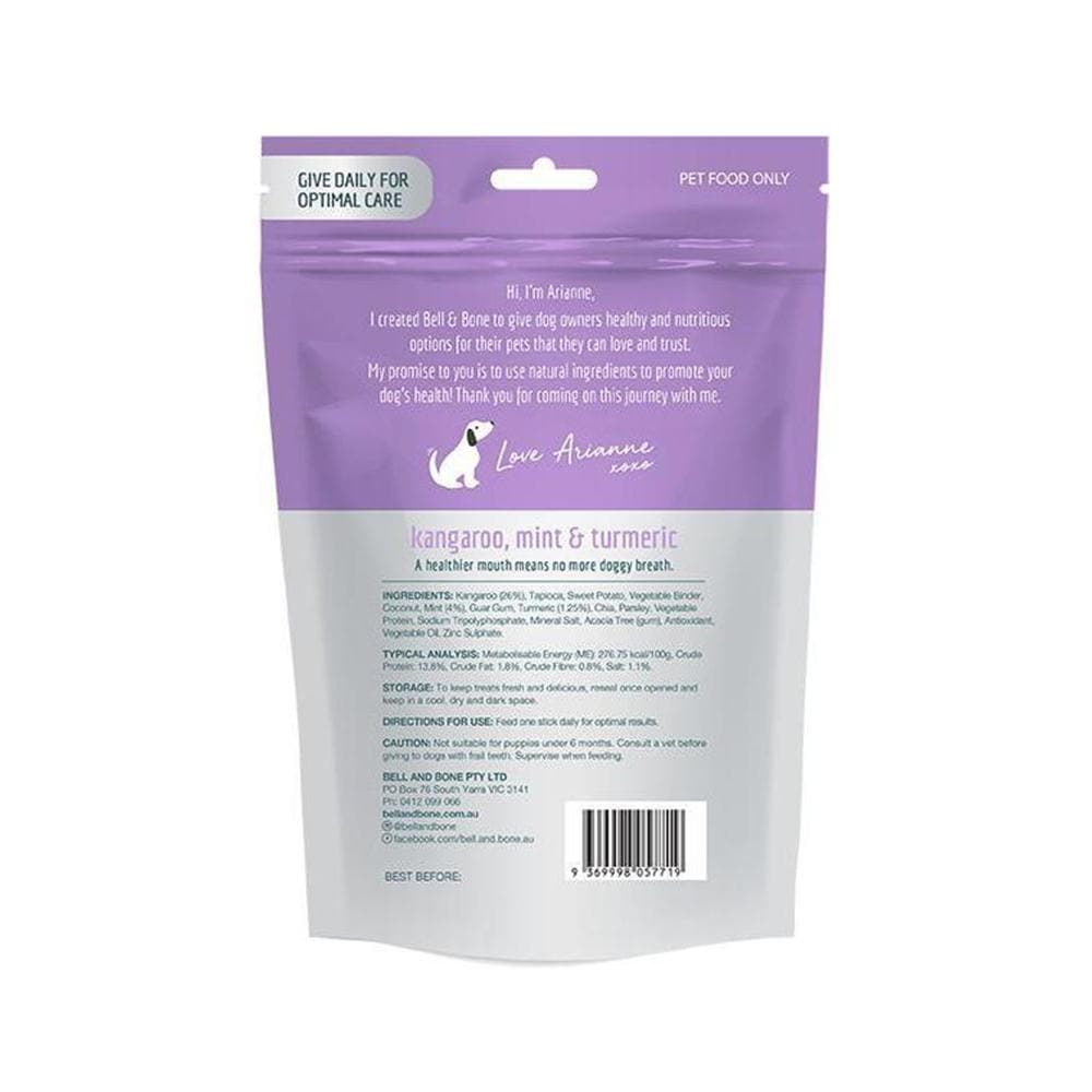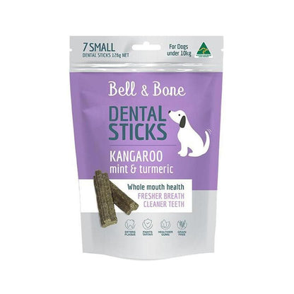 Maintaining your pet's health starts with their teeth! That is why the BELL & BONE Kangaroo, Mint & Turmeric Dental Stick Dog Treats 126g (small) can be a great option to help clean plaque and tartar off of your dog’s teeth. This product comes with natural ingredients like kangaroo, mint, and turmeric to maintain an animal's immune system as well as increase heart health. Recommended for dogs under 10kg in weight, this dog chew is sure to provide an excellent source of energy for your pup or any other small-sized breed.