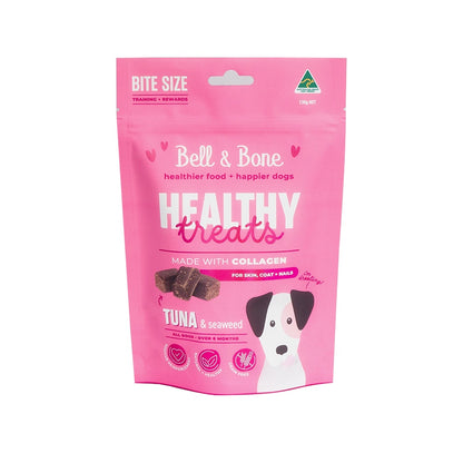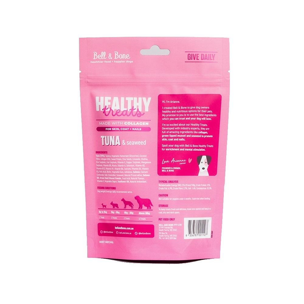 Tuna & Seaweed are expertly formulated to enhance your dog's skin, coat, and nails. Crafted with premium collagen, these treats are grain and filler-free, 100% natural, and low in fat and calories. With collagen restoring moisture in their skin, elevating their fur's shine, and strengthening their nails, your dog will feel better from the inside out. These bite-sized, chewy treats are perfect for training and rewards, promoting positive reinforcement. Follow the feeding guide for daily use and choose treats that prioritize your pet's well-being.