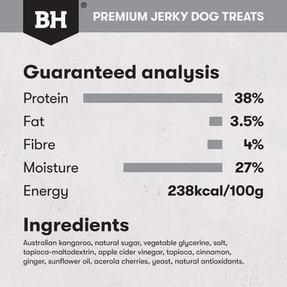 Kangaroo, Natural Sugar, Vegetable Glycerine, Salt, Tapioca-maltodextrin, Apple Cider Vinegar, Tapioca, Cinnamon, Ginger, Sunflower Oil, Acerola Cherries, Yeast, Natural Antioxidants.