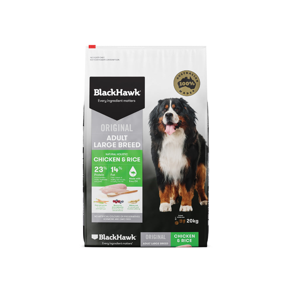 Black Hawk Formula Chicken & Rice Original is a specialized dog food for large breed adult dogs. It's enriched with amino acids vital for developing strong bones and muscles. The formula contains 23% protein sourced from high-quality meats, vegetables, and grains, catering to the nutritional needs of larger dogs. Additionally, it includes emu oil, beneficial for overall health. The product features larger sized kibble, specifically designed for bigger mouths. With 14% fat content derived from a mix of healthy fats and oils, this dog food offers a well-rounded diet, ensuring the well-being and vitality of large breed adult dogs.