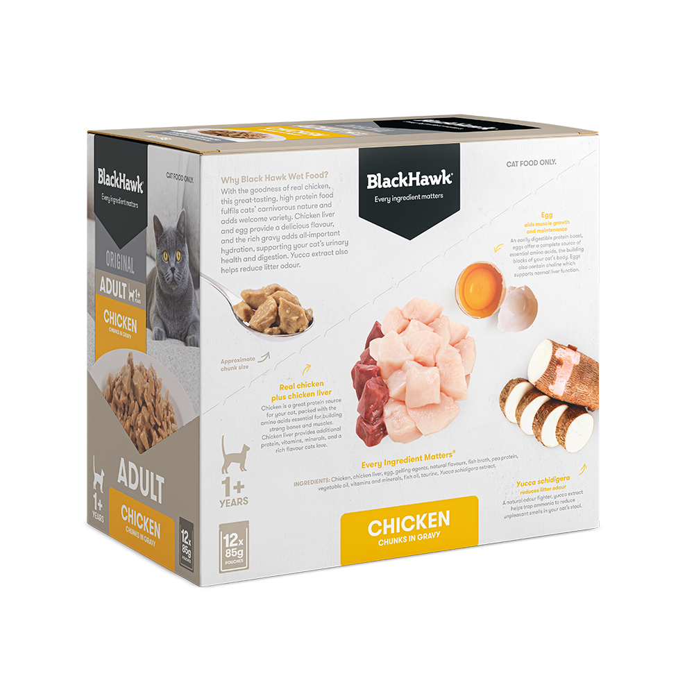 This high-protein cat food, made with real chicken, liver, and egg, caters to a cat's carnivorous diet, offering variety and enhancing taste. It includes rich gravy for hydration, benefiting urinary health and digestion, while yucca extract reduces litter odor. Chicken provides essential amino acids for strong bones and muscles, with liver adding extra protein, vitamins, and minerals. Eggs contribute to muscle growth and maintenance, offering a digestible protein source with essential amino acids and choline for liver health.