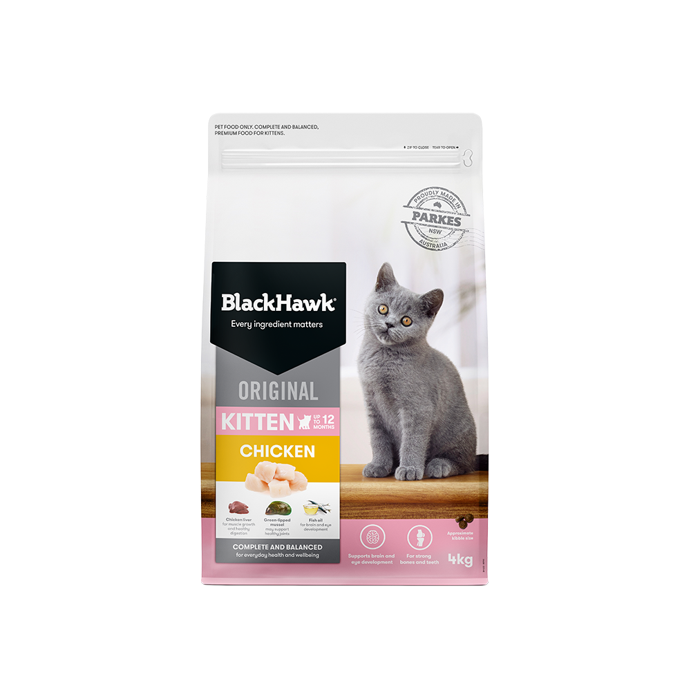 This high-quality kibble for kittens is formulated with vitamins, minerals, and essential nutrients for healthy development of bones, teeth, muscles, and brain. It features algae-β-glucan for immune support, and prebiotics and probiotics for digestive health. Real Australian chicken and hydrolysed chicken liver provide vital protein and nutrients, while omega-3-rich fish oil aids in eye and brain development, skin and fur health, and joint strength. Green-lipped mussel adds joint support, and eggs supply a digestible protein source with essential amino acids and choline for liver function.