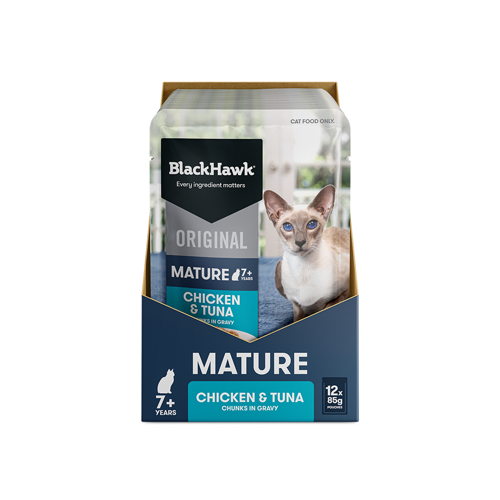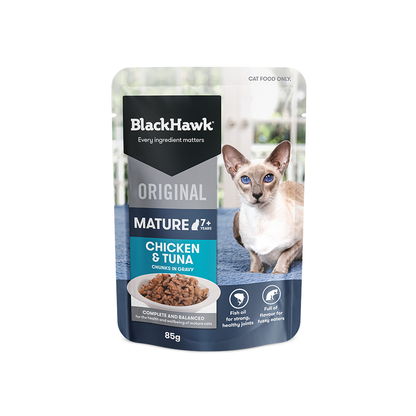 - Complete & balanced food for mature cats with real chicken and tuna for great taste.