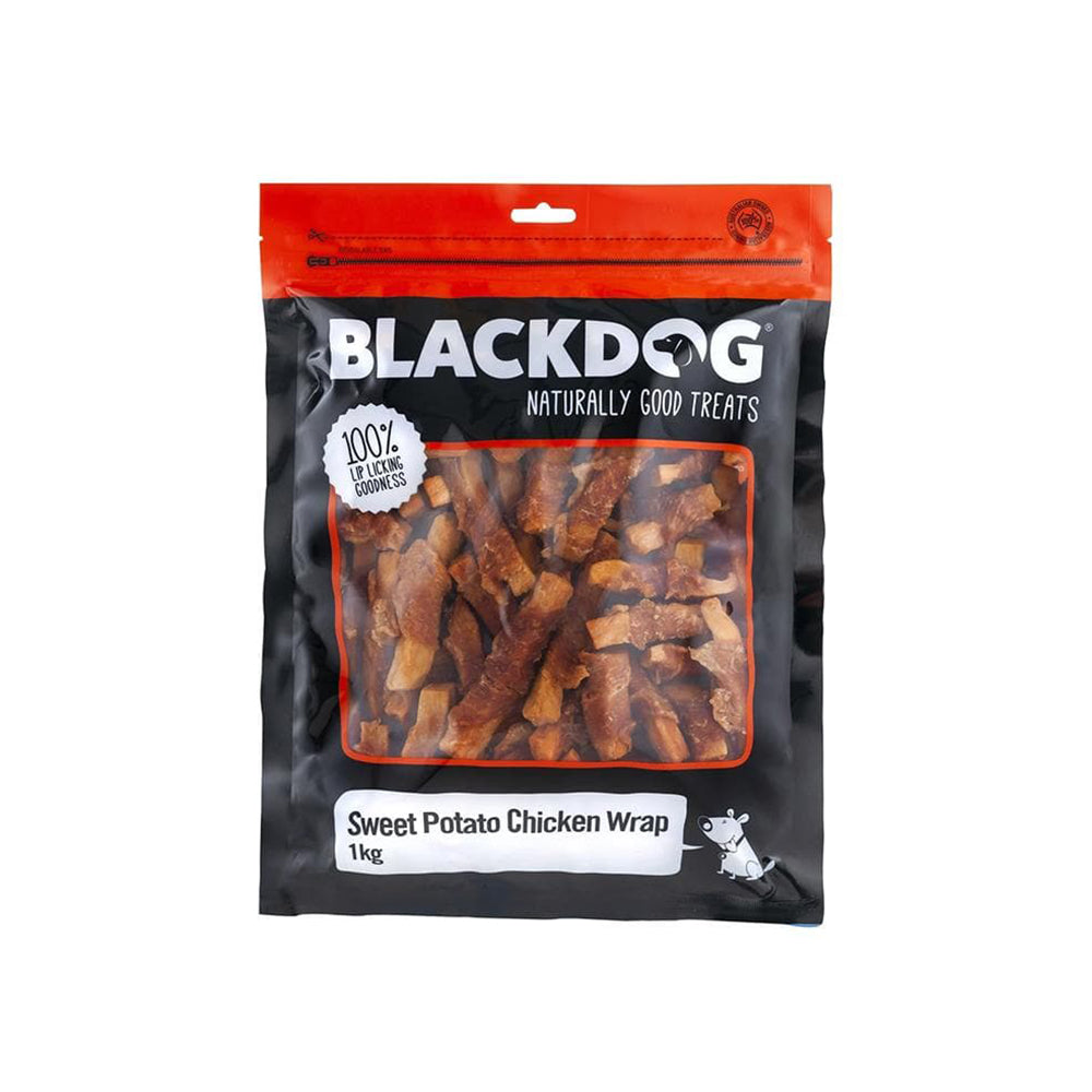 BLACKDOG Sweet Potato Chicken Wrap Dry Dog Treats 1kg crisp snack is an excellent source of vitamins, minerals and high-protein. You'll also see shiny fur and healthy skin when your dog eats these wraps! Low salt content with no flavours added makes this the perfect snack for picky eaters too.