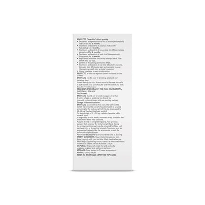 Bravecto Chew is a delicious long-lasting chew that protects your dog against paralysis ticks, fleas and more. It's safe for puppies over 8 weeks old, weighing 2kg or more, and can be used in breeding, pregnant and lactating dogs. Bravecto Chew is also ideal for treating brown dog ticks, bush ticks, Sarcoptes, Demodex and ear mites.