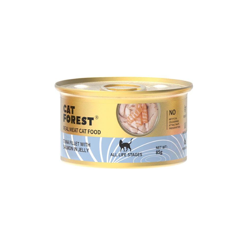 Indulge your feline friend with the savoury goodness of CAT FOREST Premium Tuna White Meat with Salmon in Jelly Canned Cat Food 85g. Made from the highest quality, human-grade ingredients, this wet cat food is specially designed to be enjoyed by cats of all breeds and life stages. It's packed with essential nutrients, high-quality proteins, and healthy Omega 3&6 (DHA/EPA) that support your cat's overall health and well-being.