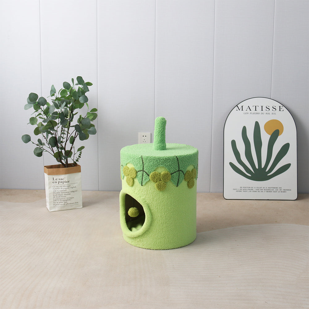 Create a serene sanctuary for your cat with the CATIO Green Grape Cat House. Designed with a round entrance that leads to a private and secure space where your cat can relax and enjoy moments of tranquillity. The hanging green plush ball at the entrance invites playful swatting and batting, keeping your cat entertained and the spacious cylinder shape ensures that your cat has ample room to move and stretch comfortably.