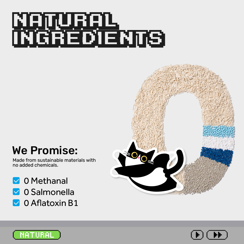 CATURE Mixed Clumping Cat Litter offers exceptional odor control upon first contact, forming tight, firm clumps within just two seconds. Its unique formulation combines 55% 1.5mm tofu pellets, 39% premium bentonite, and 6% functional additives, providing remarkable liquid absorption—300% of its own weight. Made from sustainable, natural ingredients, this litter ensures safety for your pet with no added chemicals, methanal, salmonella, or aflatoxin B1. Choose CATURE for a clean, eco-friendly litter solution that keeps your home fresh and your cat happy.