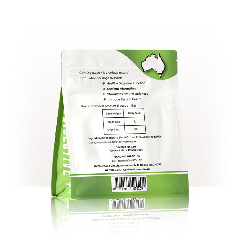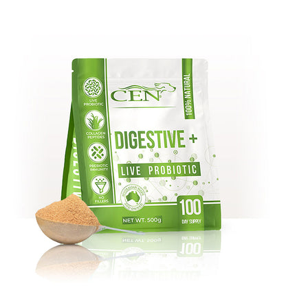 The inclusion of Live Probiotic S. boulardii contained in CEN Digestive+ Dog Probiotics is unique in that it can’t be killed by antibiotics. It helps restore your dog’s microbiome during and after antibiotic use and has been successfully used to treat Yeast Infections and Candida.
