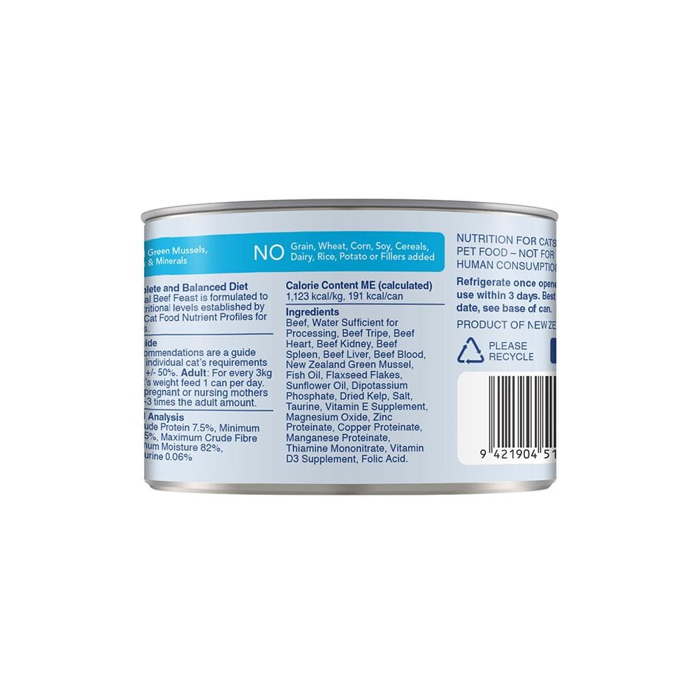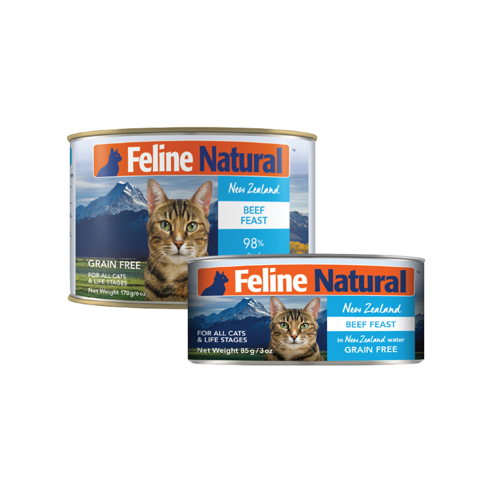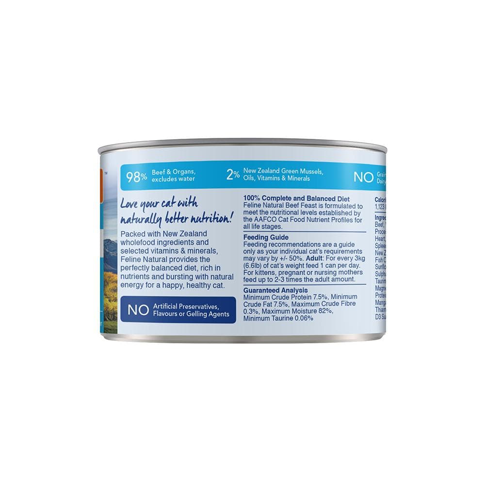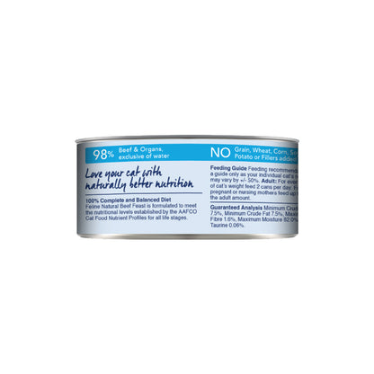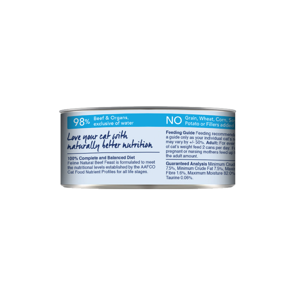 FELINE NATURAL Beef Feast Grain Free Cat Food 170g is a 100% natural dish made from 98% grass-fed beef and organs. For an added dose of nutrients, it contains essential vitamins and minerals for healthy cats, such as Taurine, to keep their heart happy and healthy. No added artificial preservatives to this canned variety, so you can feed your feline friend with confidence that it's only the best meat possible. A product worthy of feeding them just because they're amazing.