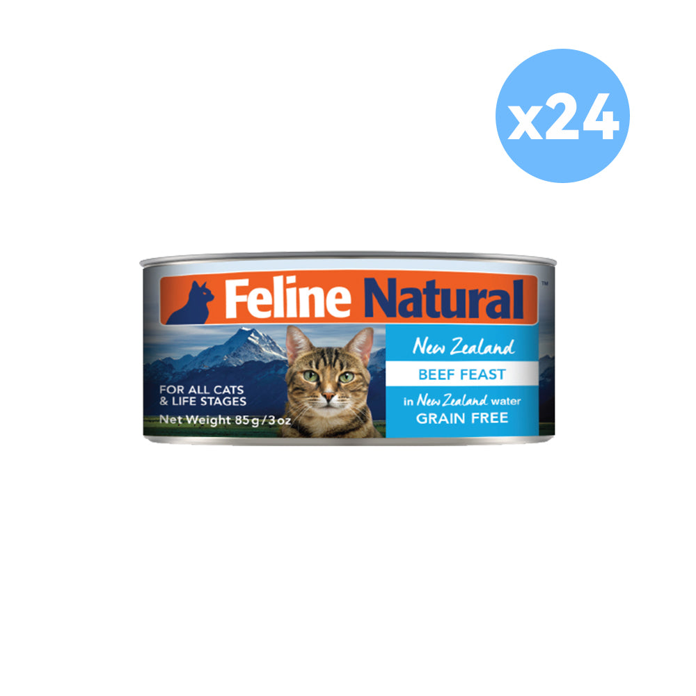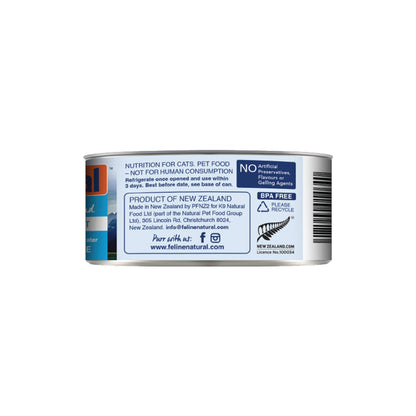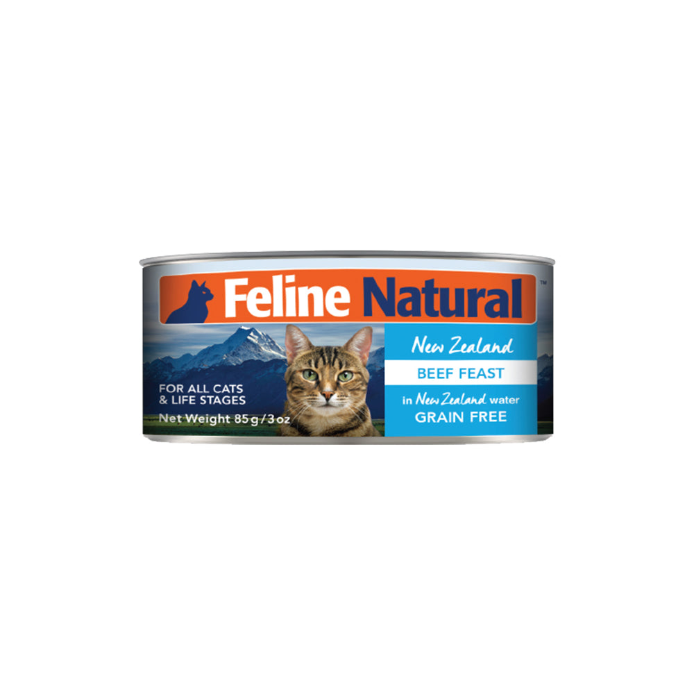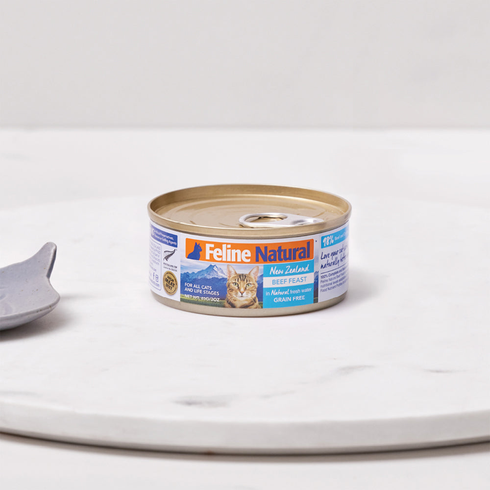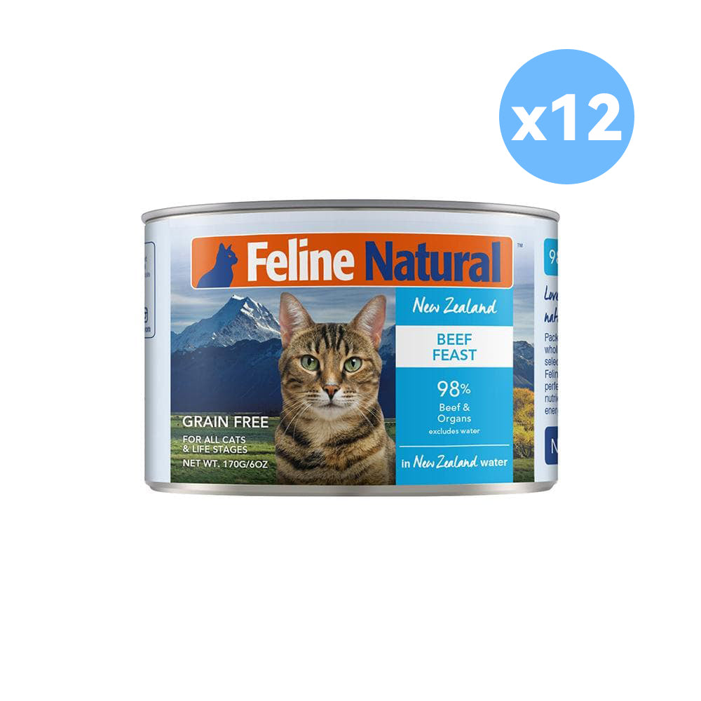 FELINE NATURAL Beef Feast Grain Free Cat Food 170g is a 100% natural dish made from 98% grass-fed beef and organs. For an added dose of nutrients, it contains essential vitamins and minerals for healthy cats, such as Taurine, to keep their heart happy and healthy. No added artificial preservatives to this canned variety, so you can feed your feline friend with confidence that it's only the best meat possible. A product worthy of feeding them just because they're amazing.