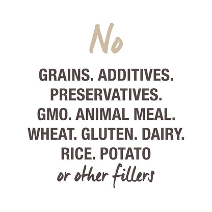 - NO wheat, gluten, GMO ingredients, corn, soy, cereals, dairy, rice, potato & all other fillers.