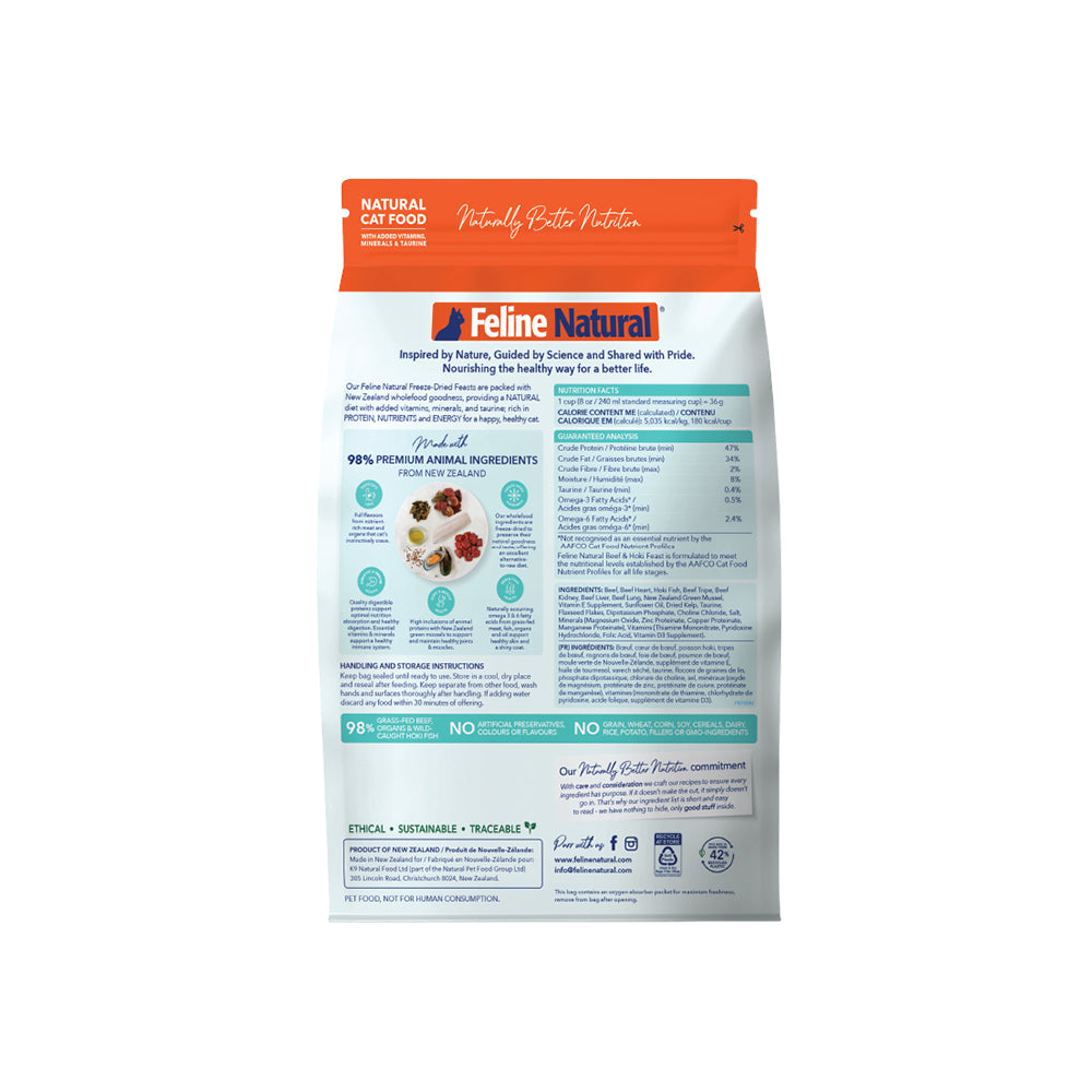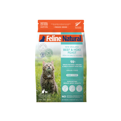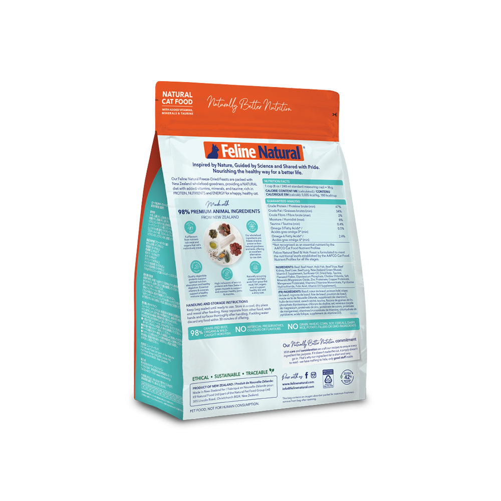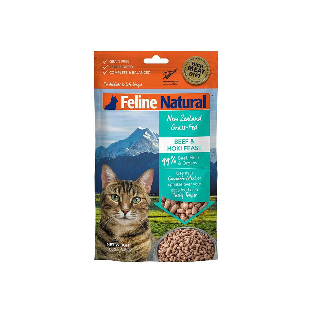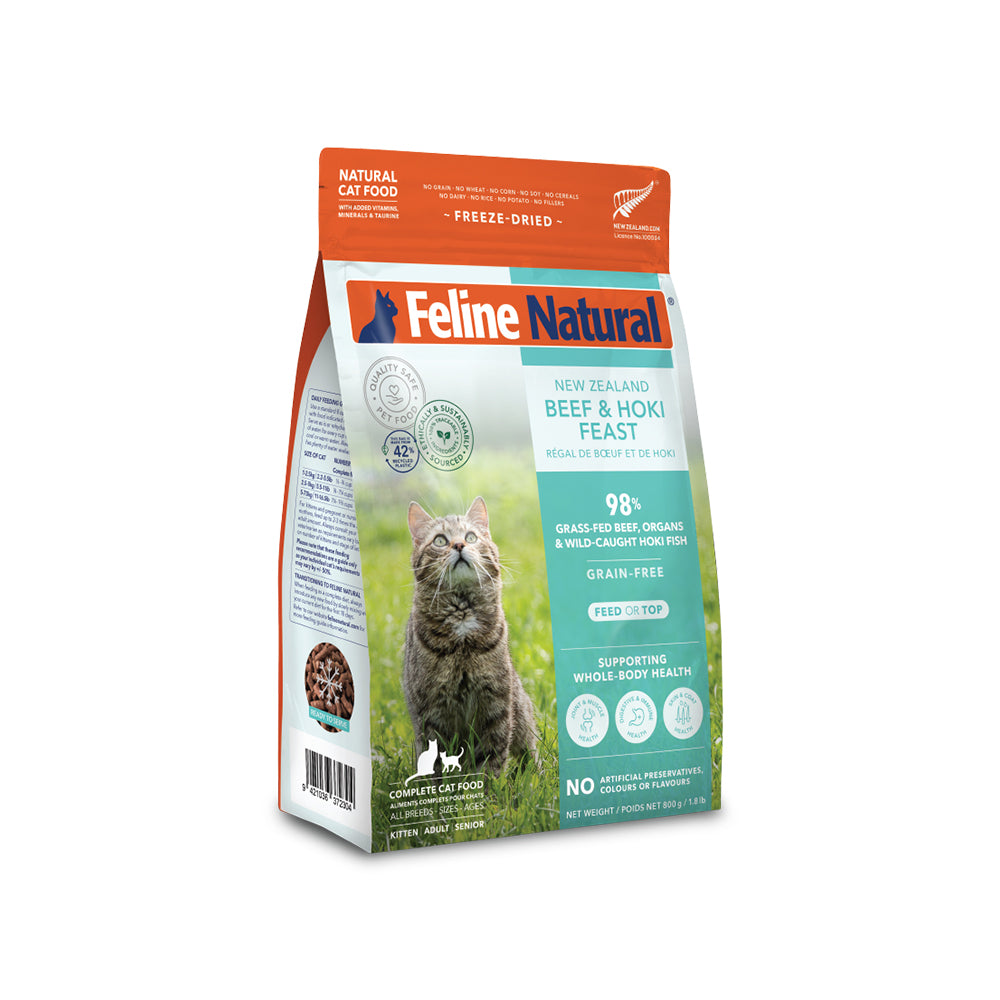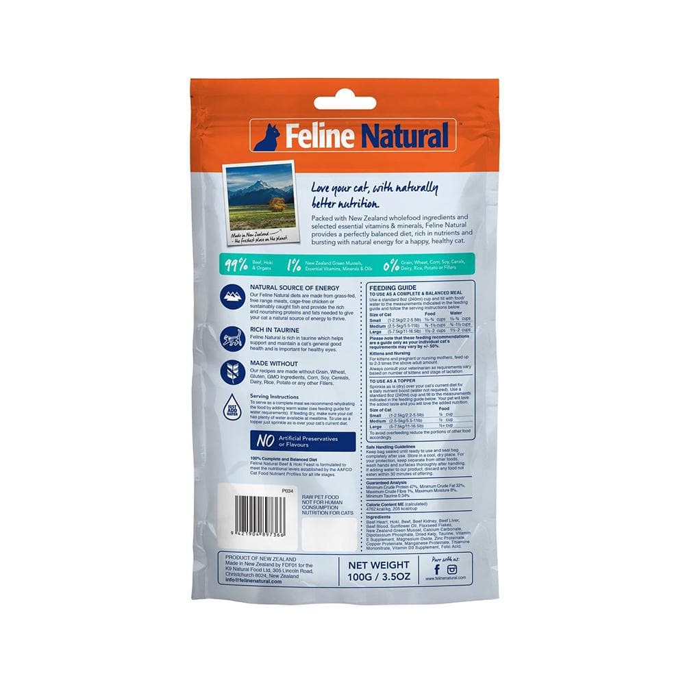 FELINE NATURAL Beef & Hoki Freeze Dried Cat Food 100g is an innovative, complete, healthy meal for you and your cat. Formulated using premium New Zealand meat with NZ green-lipped mussels and other natural ingredients to give long-term health benefits to your feline. A delicious and complete meal food that complements your loving care of your pet.