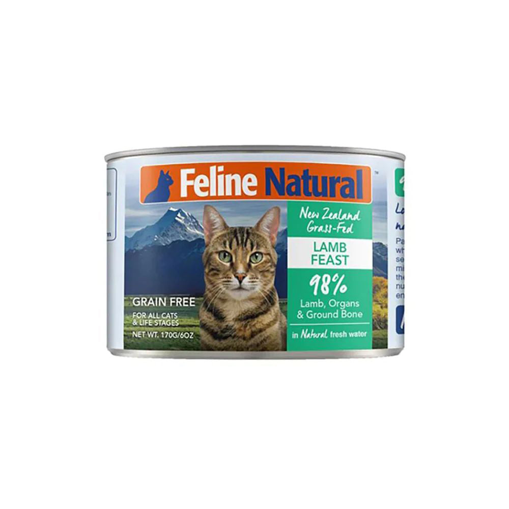 FELINE NATURAL Lamb Feast Grain Free Cat Food 170g (canned) is a high quality, low-cost good eats. Made up of organic lamb combined with vitamins and minerals to help your furry friend feel their best. With this product, you are sure to have no worries about mess or waste because it comes in an easy-open can so you can feed your cat whenever you need them satisfied. Provides premium taste without the price tag! So if bad breath, overweight, hairball syndrome has been troubling your feline friend lately then it might be time for you to give them FELINE NATURAL!