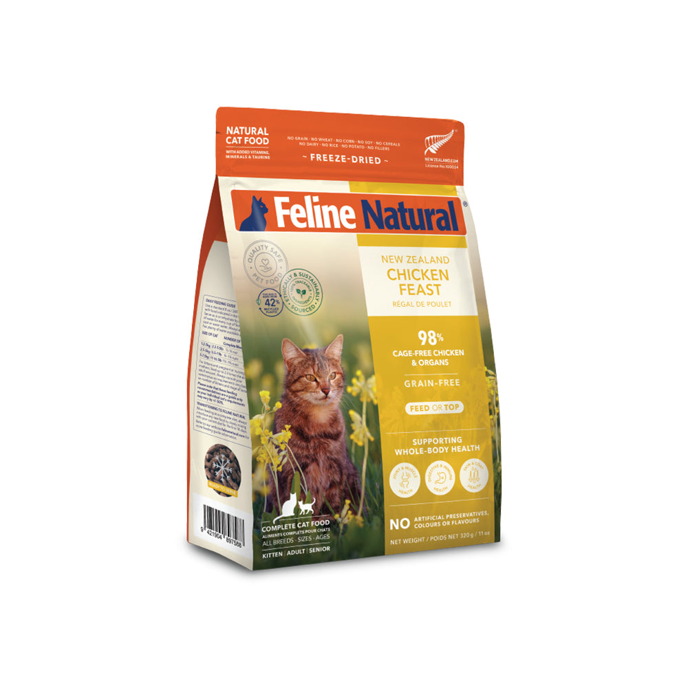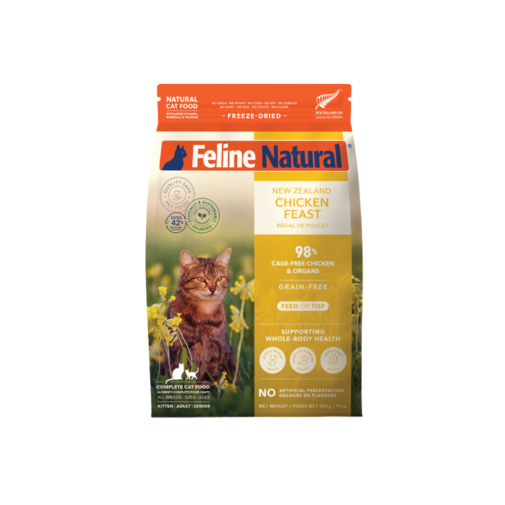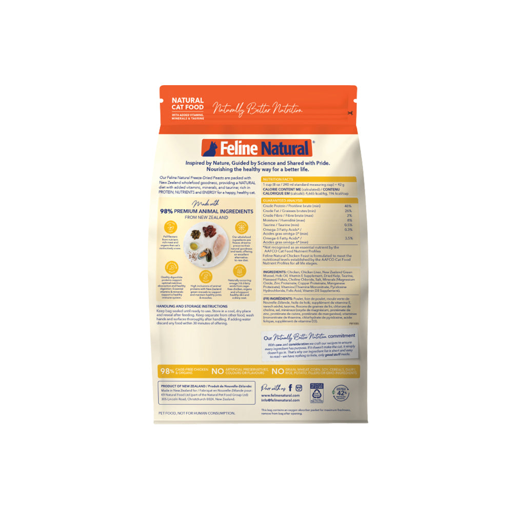 FELINE NATURAL Chicken Freeze-Dried Cat Food is a complete and balanced meal made in New Zealand using cage-free chicken. This single-protein diet is highly palatable and provides an excellent source of quality proteins and fats. Freeze-dried to retain maximum nutrients and flavor, it supports your cat’s overall health. Enriched with taurine, it promotes healthy eyes and overall well-being, making it an ideal choice for a natural and wholesome diet. Perfect for cats who thrive on high-quality, nutrient-dense meals.