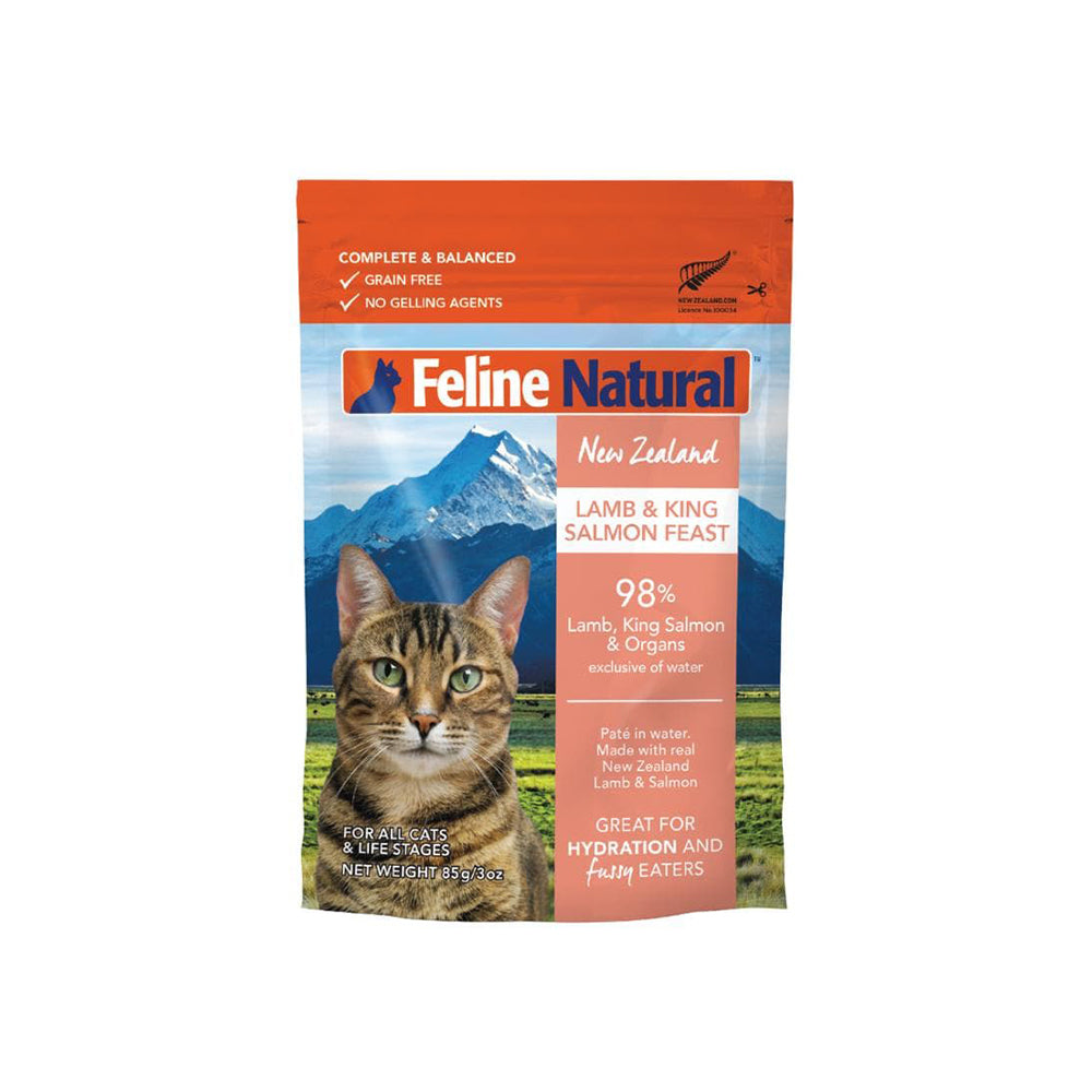 FELINE NATURAL is made with 98%+ grass-fed, free-range lamb and sustainably caught salmon from New Zealand. Each pouch includes only the necessary water to hydrate, giving your cat a complete and balanced diet without any unnecessary carbs or gelling agents. FELINE NATURAL comes in an easy-open pouch, so you always have what you need for those hungry moments when pet parenting surprises come up. It's perfect for cats of all life stages as it contains no grain, providing healthy protein sources such as meat, fish meal, poultry meal, marine collagen peptides and natural prebiotic fibre for digestive health.