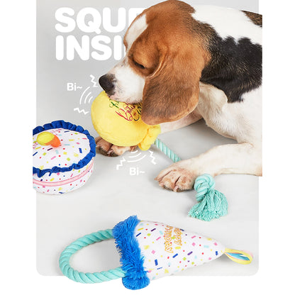 FOFOS Birthday Balloon Plush Squeaky Dog Toy is the ultimate atmosphere enhancer. For your dog, our durable stuffed plush toy brings endless fun with multiple designs. Filled with high-quality PP cotton, it offers excellent resilience and double filling for extra fullness, ensuring it won't collapse after prolonged chewing. The squeaky sound feature grabs your dog's attention, making playtime exciting. Perfect for interactive games like fetch and tug-of-war, this toy strengthens bonds. It's bite-resistant, tear-resistant, pull-resistant, durable, shed-resistant, and gentle on teeth, ensuring safe, long-lasting enjoyment.