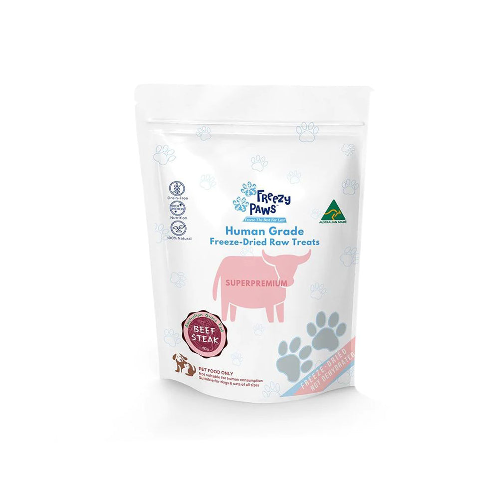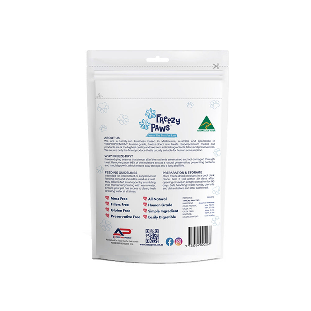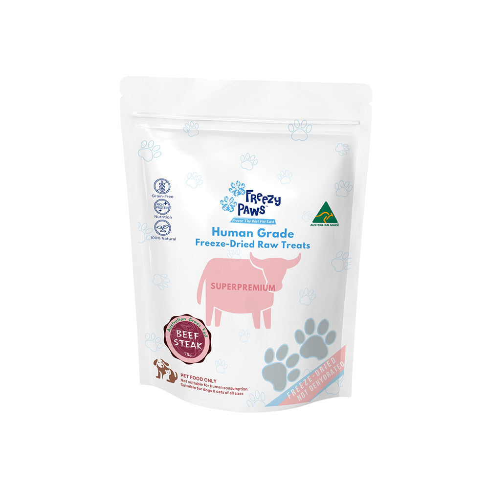 Freezy Paws Beef Steak Dogs & Cats Treats 70g are free from artificial colors, flavors, and preservatives, making them a healthy and delicious treat that your pets will love. Order now and give your pets a snack they'll crave, while also providing them with the nutrition they need to thrive.