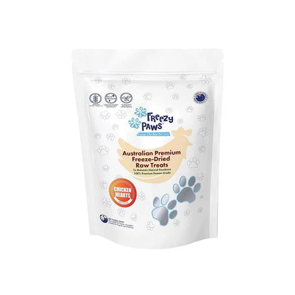 FREEZY PAWS Chicken Hearts Freeze Dried Pet Treats 100g is perfect for dogs and cats of all ages, sizes and breeds, and it's freeze-dried to lock in all the nutrients and vitamins of raw meat that would otherwise be lost or damaged in the cooking process. Grain-free and gluten-free treats that are rich in protein and contain no added preservatives, colours, flavours, fillers or any artificial ingredients.