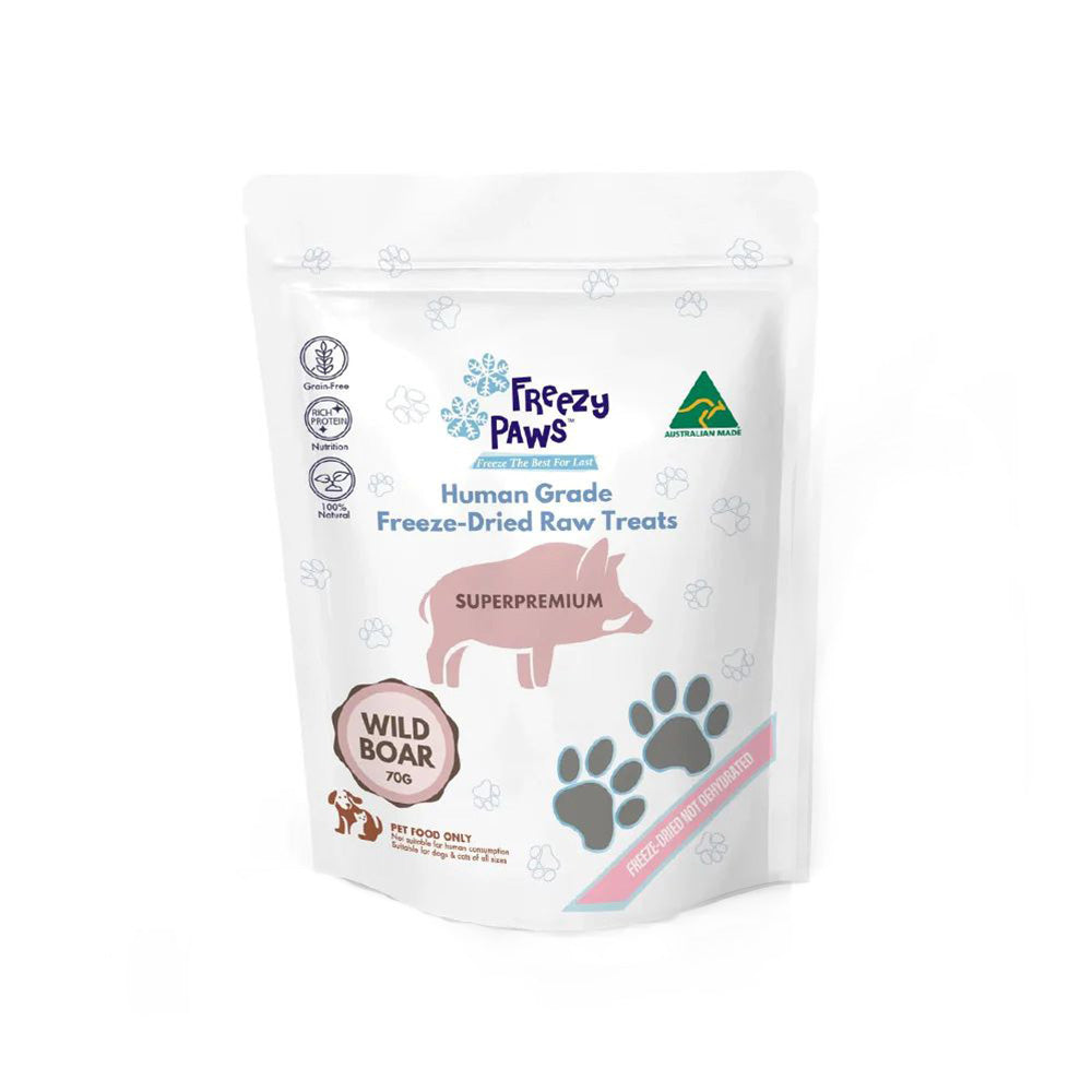 Wild boar is lean and low in cholesterol, making these treats easier on your pet's stomach. They are made from wild boar meat containing all the necessary amino acids to maintain your dog's or cat's health. Wild boar meats also contain healthy levels of vitamins that support their overall well-being. FREEZY PAWS Wild Boar Freeze-Dried Dog & Cat Treats 70g are the complete and balanced goodies you can give to your pet, surely they will keep coming back for more.