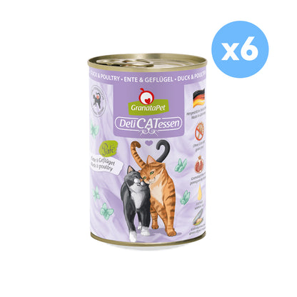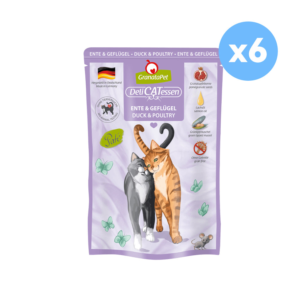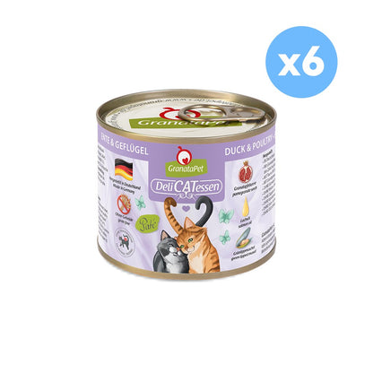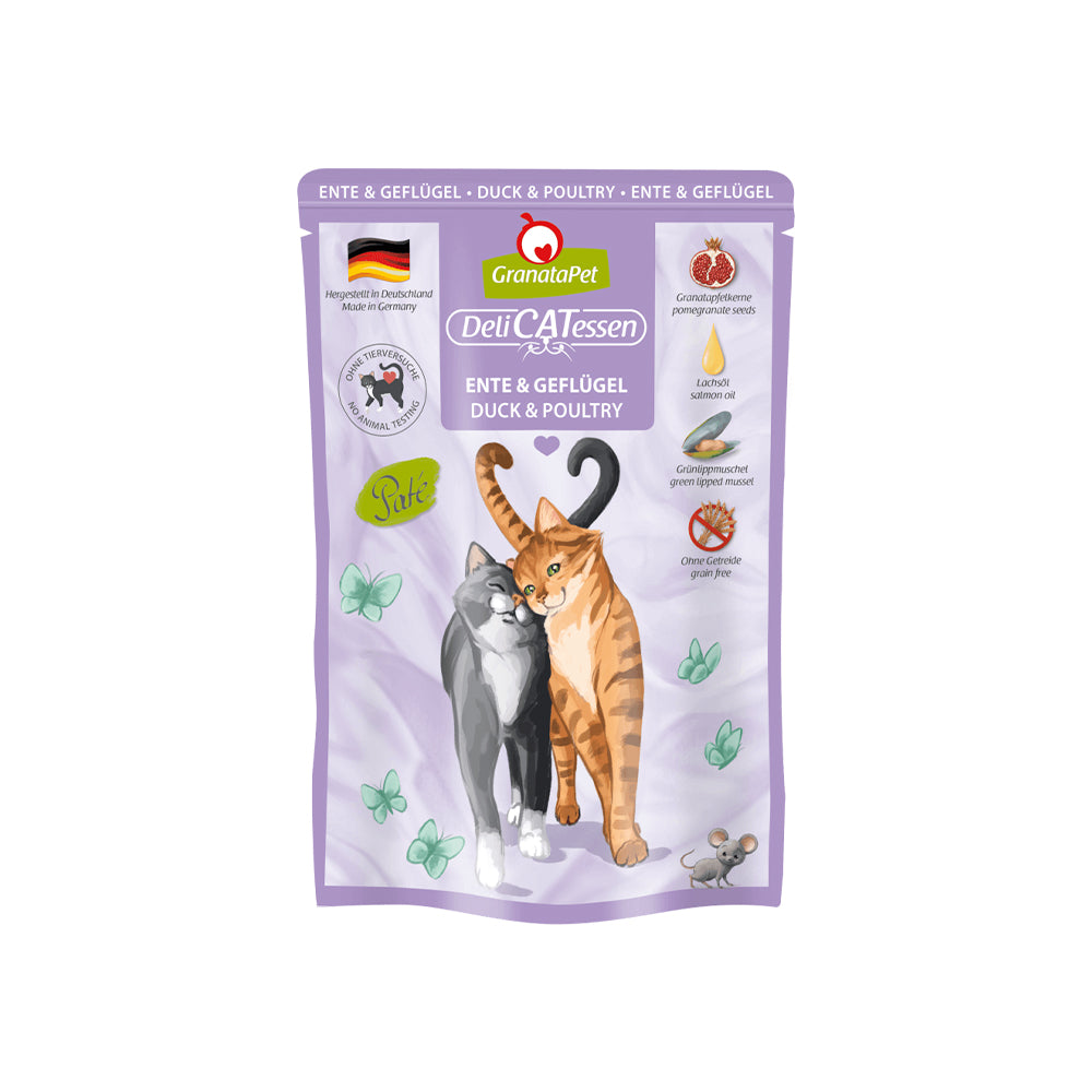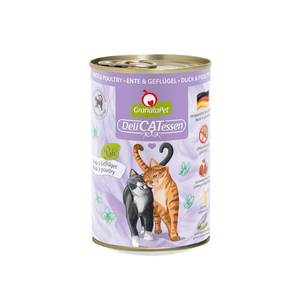 GRANATAPET Delicatessen Duck & Poultry Cat Wet Food is a premium paté, formulated for adult cats. It is made to follow your cat’s natural diet and stands out with its grain-free composition, excluding cereals, artificial colours, and flavourings.