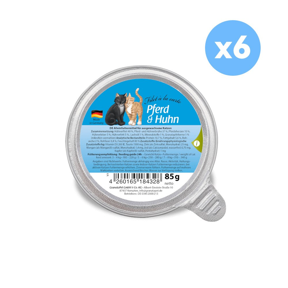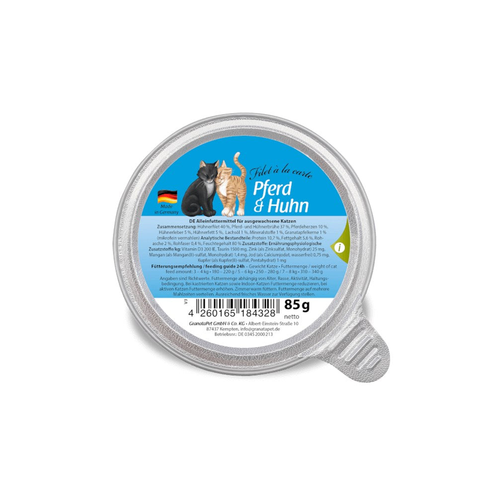 GRANATAPET Filet À La Carte Horse & Chicken Cat Wet Food formula is enriched with premium salmon oil and pomegranate seeds. This top-grade natural wet food is gently cooked in its own meat broth, making it especially tasty and easy to digest. Salmon oil helps protect your cat's skin, ensuring silky, glossy coat. Moreover, minerals, taurine, and other vital ingredients make this juicy menu a balanced whole food diet.
