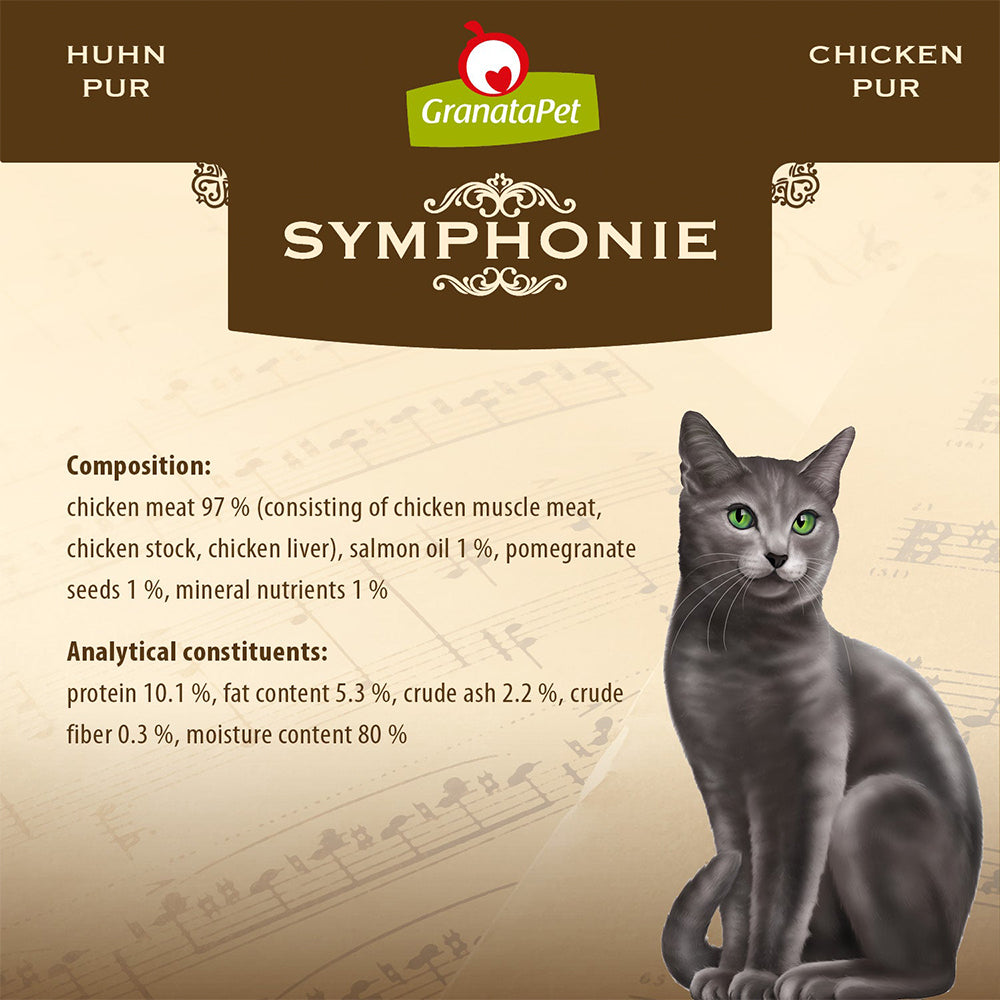Chicken Meat 97 % (Consisting Of Chicken Muscle Meat, Chicken Stock, Chicken Liver), Salmon Oil 1 %, Pomegranate Seeds 1 %, Mineral Nutrients 1 %.