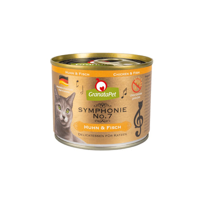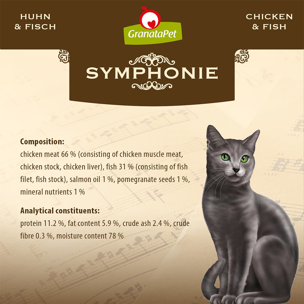 A 100% grain-free diet offers your cat wholesome nutrition to support a healthy lifestyle. GRANATAPET Symphonie No. 7 Chicken & Fish Cat Wet Food is the ultimate choice for discerning cat owners. Crafted to perfection, this complete food for adult cats features an especially generous serving of tender chicken and fish chunks, delicately blanched and gently cooked during packaging. The result is a natural jelly, cherished by cats as a true delicacy.