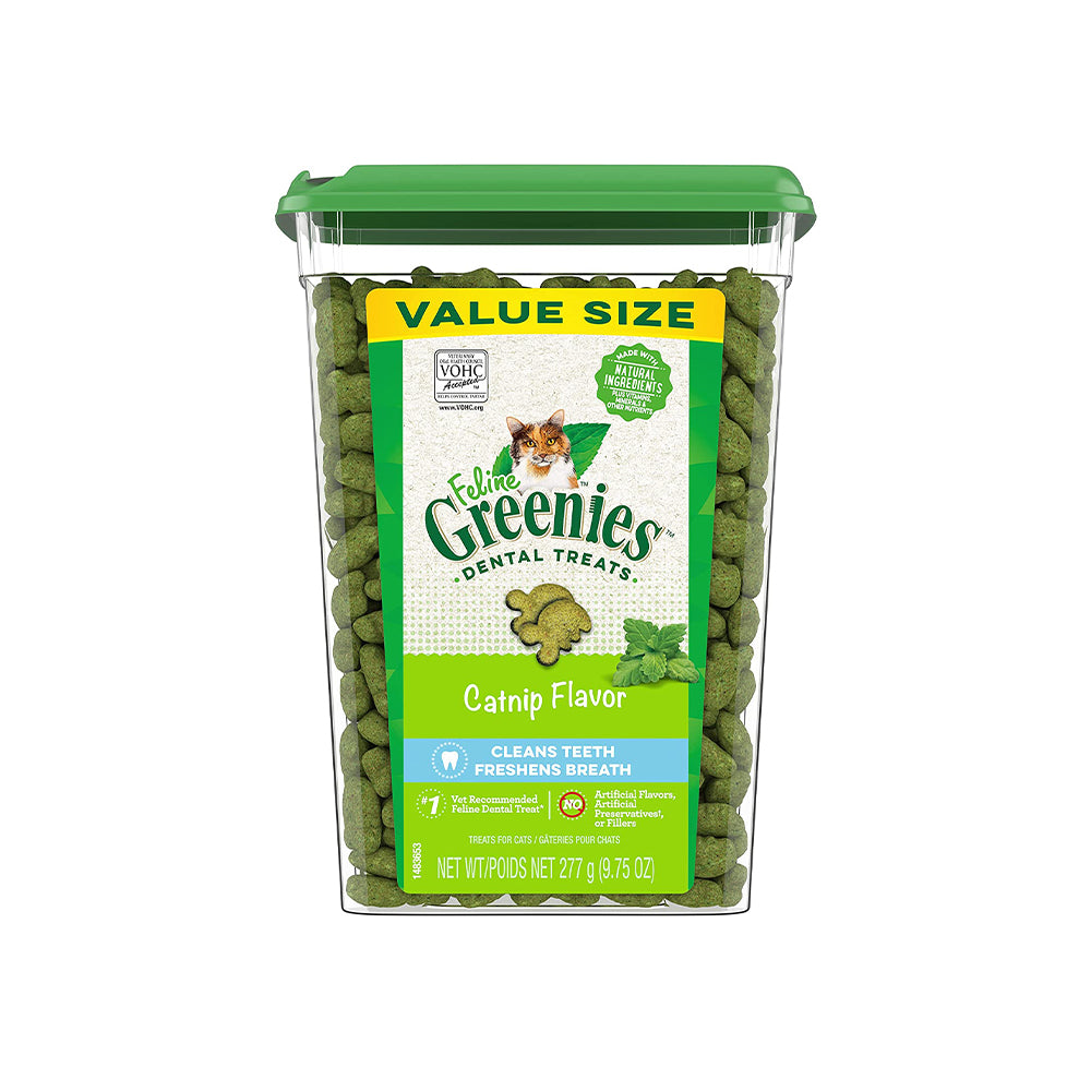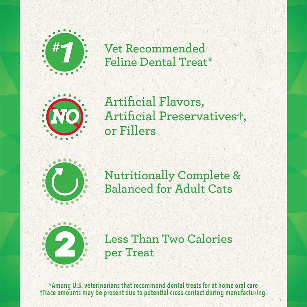 FELINE GREENIES™ Dental Treats are formulated for cats 1 year of age or older. For a healthy dental benefit, feed a 10 lb adult cat 8 treats, two times per day in conjunction with your cat's regular diet. Adjust the amount of main meal to compensate for calories delivered by treats.