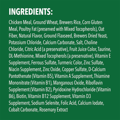 Chicken Meal, Ground Wheat, Brewers Rice, Corn Gluten Meal, Poultry Fat (preserved with Mixed Tocopherols), Oat Fiber, Natural Flavor, Ground Flaxseed, Brewers Dried Yeast, Potassium Chloride, Calcium Carbonate, Salt, Dried Catnip, Choline Chloride, Citric Acid (a preservative), Fruit Juice Color, Taurine, DL-Methionine, Mixed Tocopherols (a preservative), Vitamin E Supplement, Ferrous Sulfate, Turmeric Color, Zinc Sulfate, Niacin Supplement, Zinc Oxide, Copper Sulfate, D-Calcium Pantothenate (Vitamin B5), Vitamin A Supplement, Thiamine Mononitrate (Vitamin B1), Manganous Oxide, Riboflavin Supplement (Vitamin B2), Pyridoxine Hydrochloride (Vitamin B6), Biotin, Vitamin B12 Supplement, Vitamin D3 Supplement, Sodium Selenite, Folic Acid, Calcium Iodate, Cobalt Carbonate, Rosemary Extract.