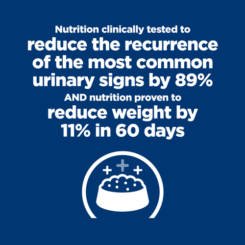 Designed by Hill’s veterinarians and nutritionists, this advanced formula helps reduce the recurrence of common urinary signs by 89% while supporting safe weight reduction — with studies showing an average 11% body weight reduction in 60 days.