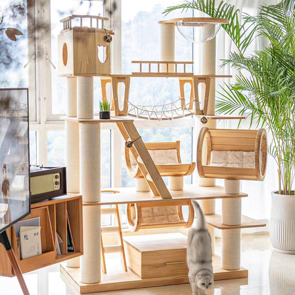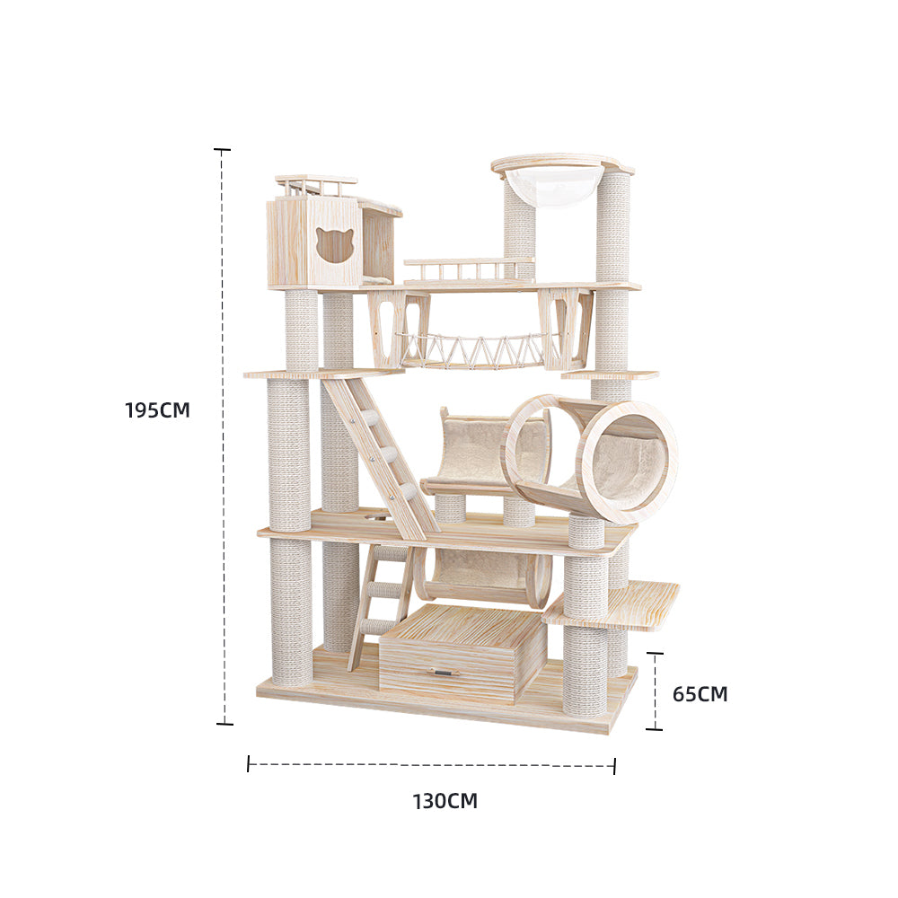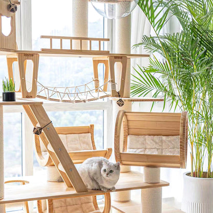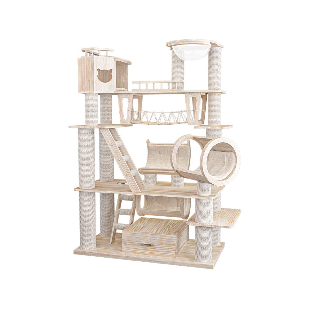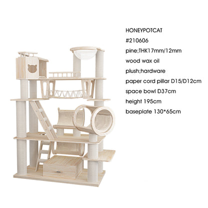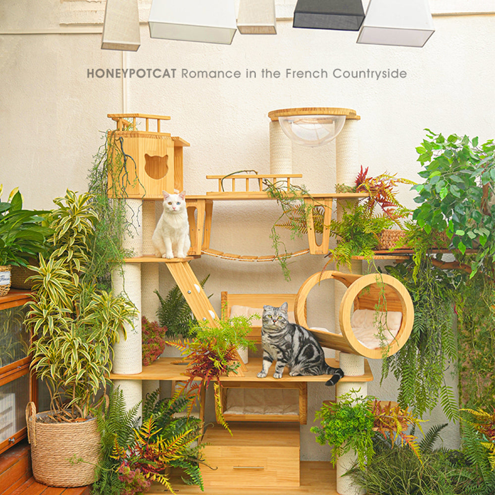 HONEYPOTCAT Monaco Elite Cat Estate is an all-in-one cat castle that specifically designed to enhance your cat's quality of life. With its thoughtful design, this cat estate creates more space for your cat to play and explore, transforming your home into a dynamic playground. Each element of the design adds an artistic touch, infusing life and vitality into your living space. Features like the aerial corridors, space bowls, and various-sized tunnels cater to your cat's diverse exploration needs, offering more opportunities for interaction, rest, and play. This cat tree turns your home into a feline paradise, giving your cats the freedom and joy they deserve.