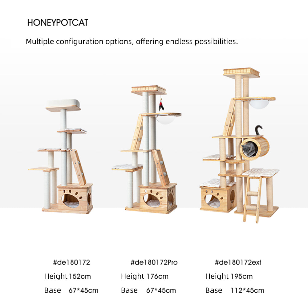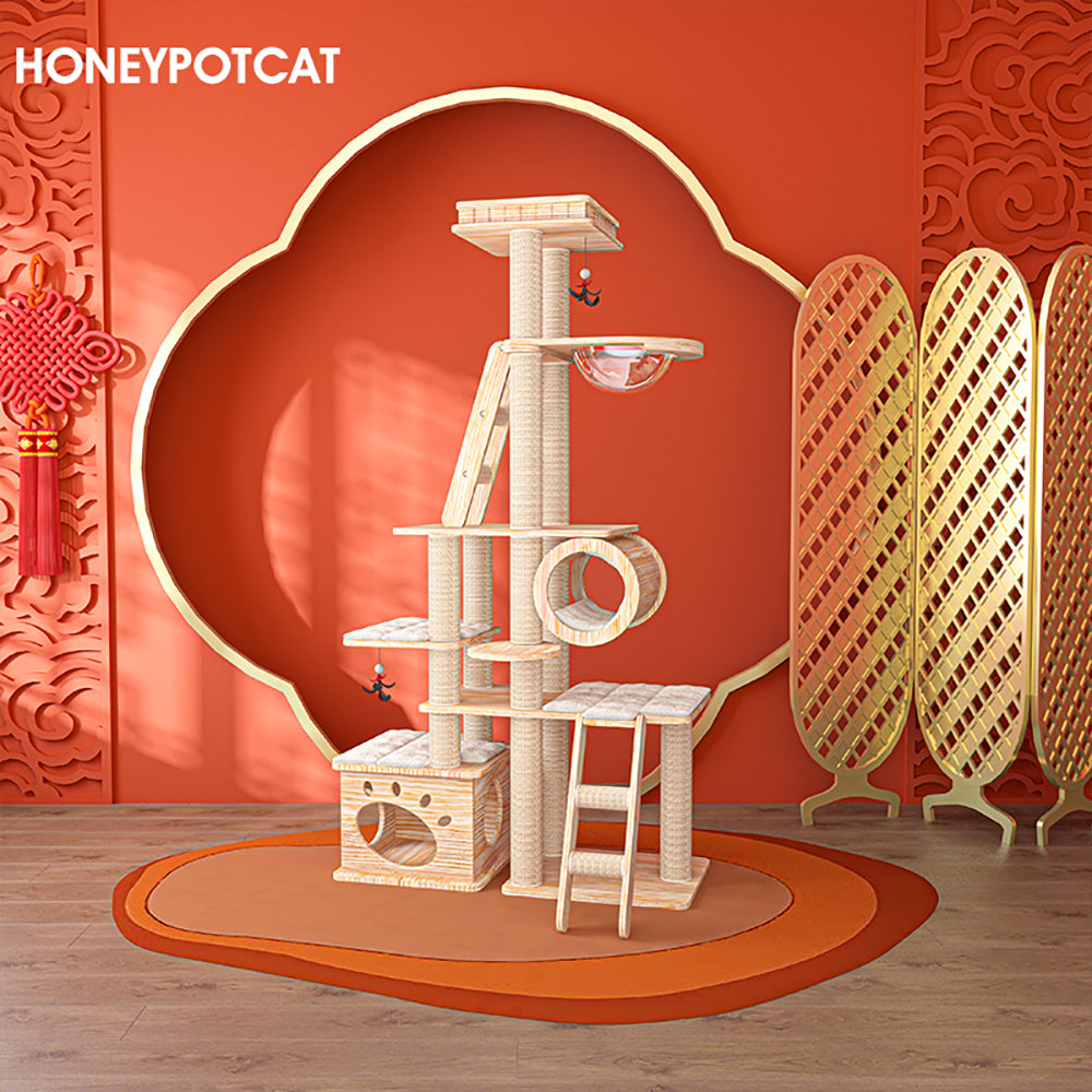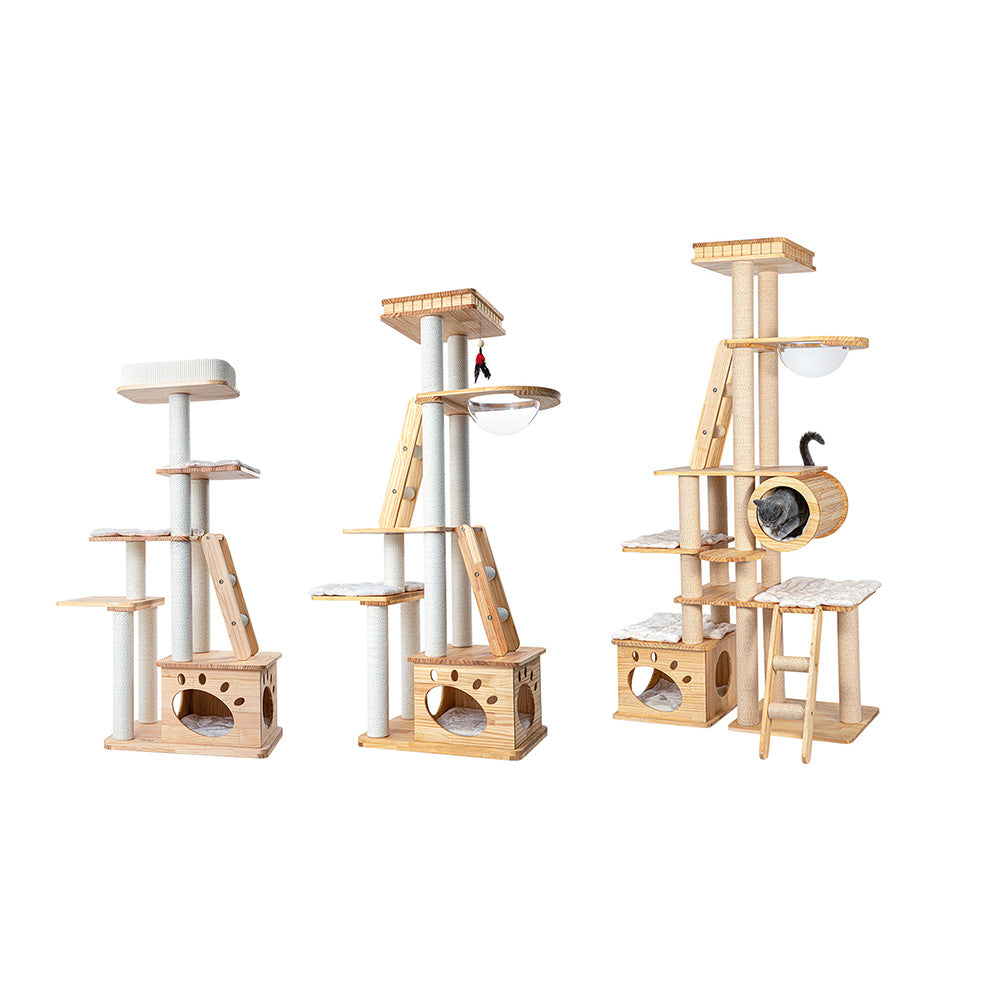Climbing high to rest and overseeing their territory is a natural habit of cats. "Lying in the sun, dreaming away, and suddenly rolling off... such accidents won’t happen anymore." The top wooden cat nest is equipped with protective rails to prevent tipping. The elegant staircase design and multiple platforms offer cozy spots for both lounging and resting. The beveled wood edges are smooth and polished, enhancing the aesthetic and providing a high-quality, rounded feel. The material is odor-free, resistant to fur buildup, insect-proof, and features scratch-resistant pads that are gentle on your cat’s paws.
