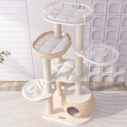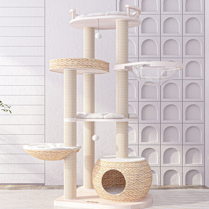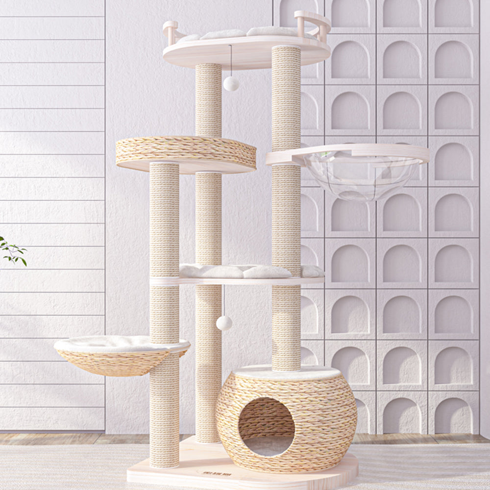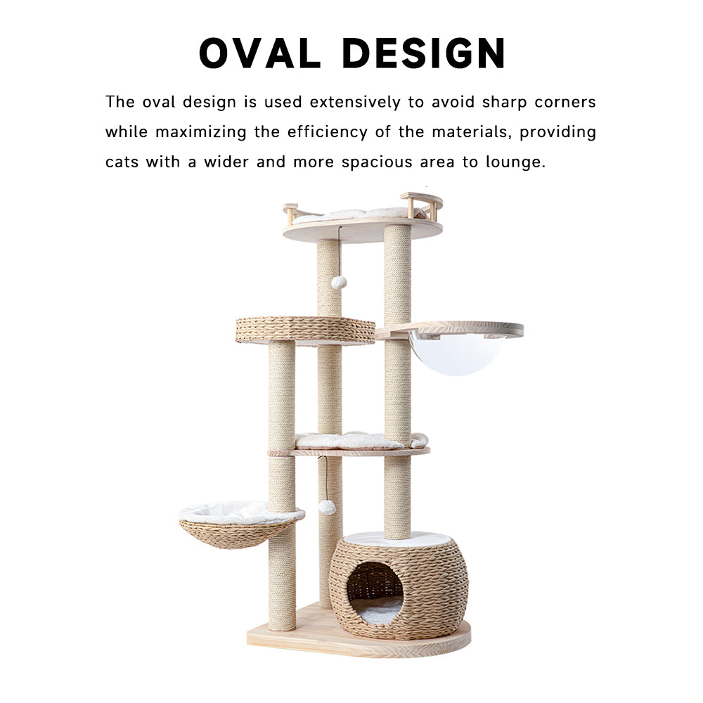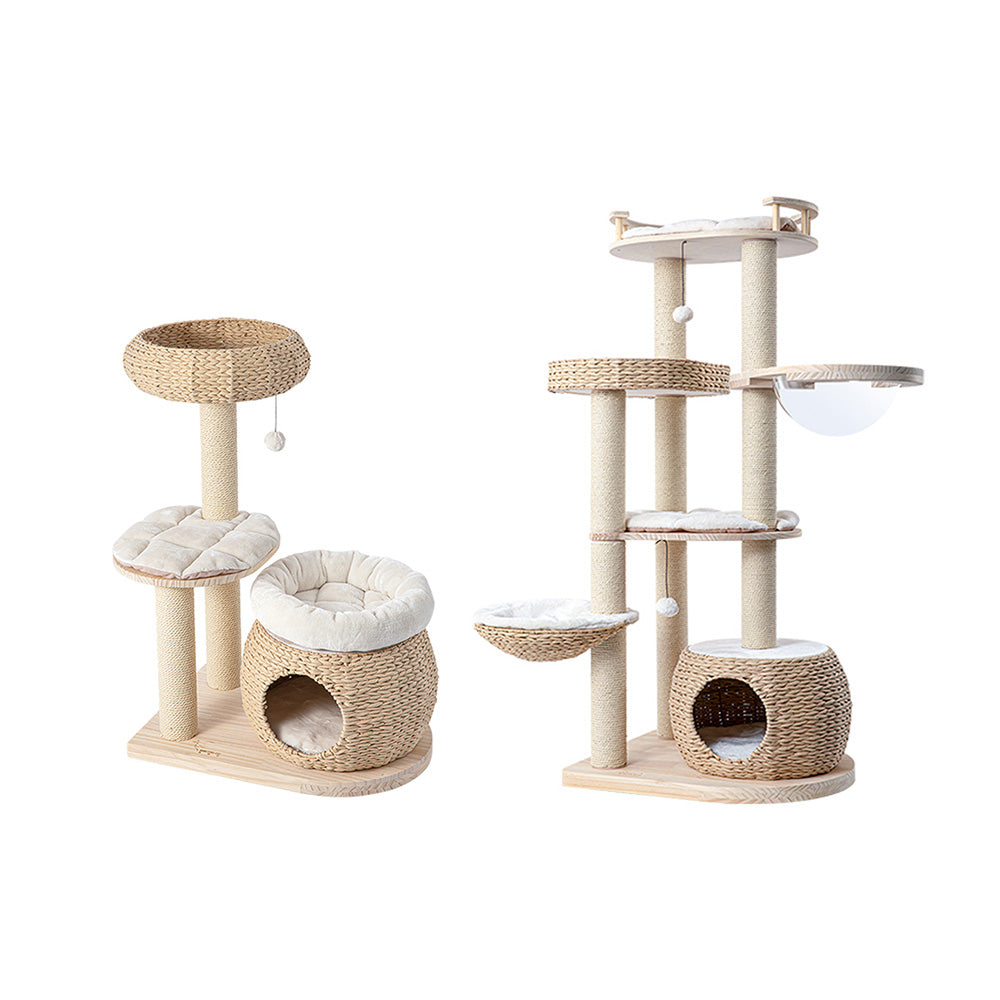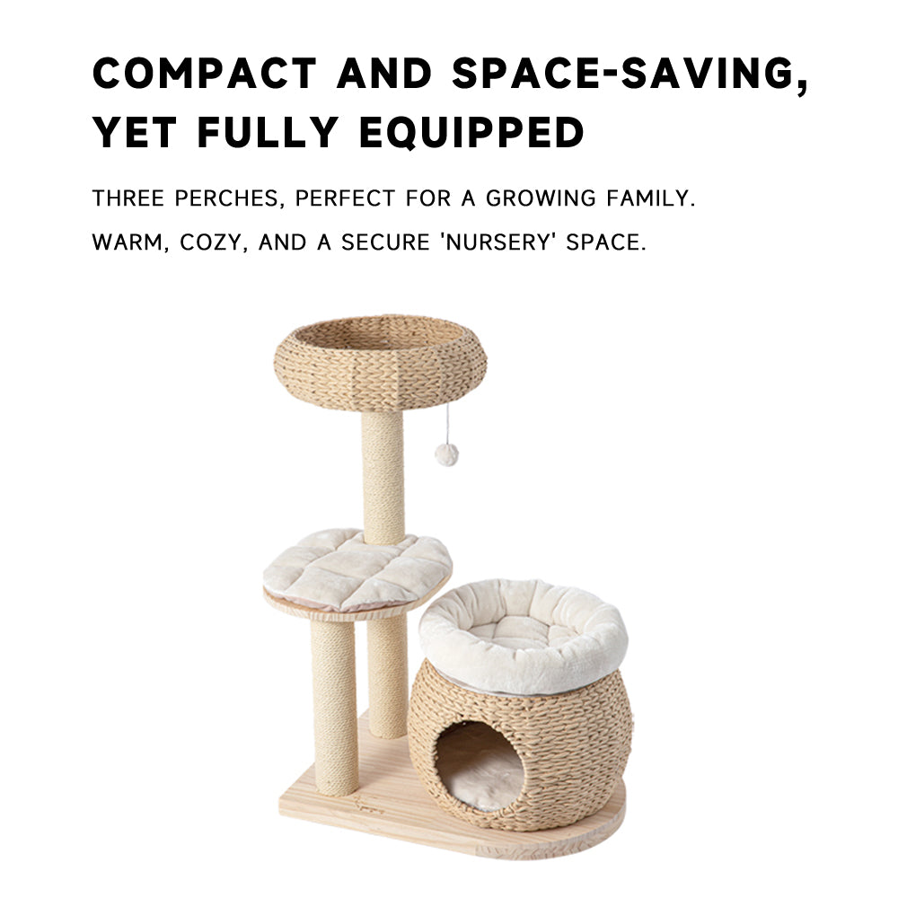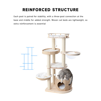 Compact and space-saving, yet with high-end features, HONEYPOTCAT Woven Cat Furniture provides a safe and independent space for your cat. The unique multi-strand, multi-layer paper rope weaving technique makes it more durable and scratch-resistant. Its material is tightly woven, smooth, and breathable, perfect for summer, and resistant to mold. And use of oval shapes helps avoid sharp corners while maximizing the efficiency of the materials, giving your cat a larger resting area. Each column is connected in pairs, and the three-way connections on the lower and middle levels further strengthen the overall structure. Weaving-style cat beds are lightweight, so added structural reinforcement ensures safety and peace of mind.