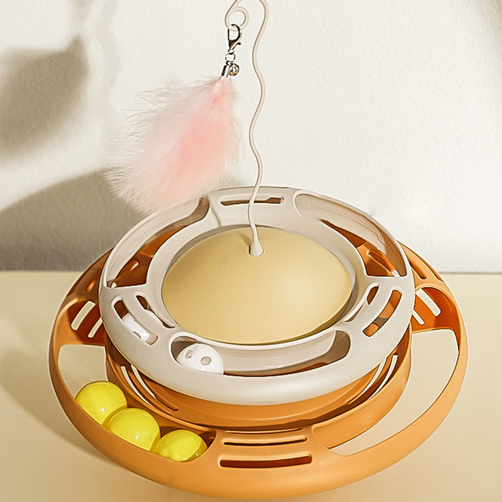 KARA PET White Yellow Cat Turntable Toy With Balls is designed with two levels of tracks for interactive playtime for your cats. 1st level comes with three spinning moving balls, while the second level offers two and a flexible pole with a dangling feather toy at the tip. This brightly-coloured toy helps to keep your furry friends entertained and active for hours, ensuring they don't experience any boredom or depression during their downtime.