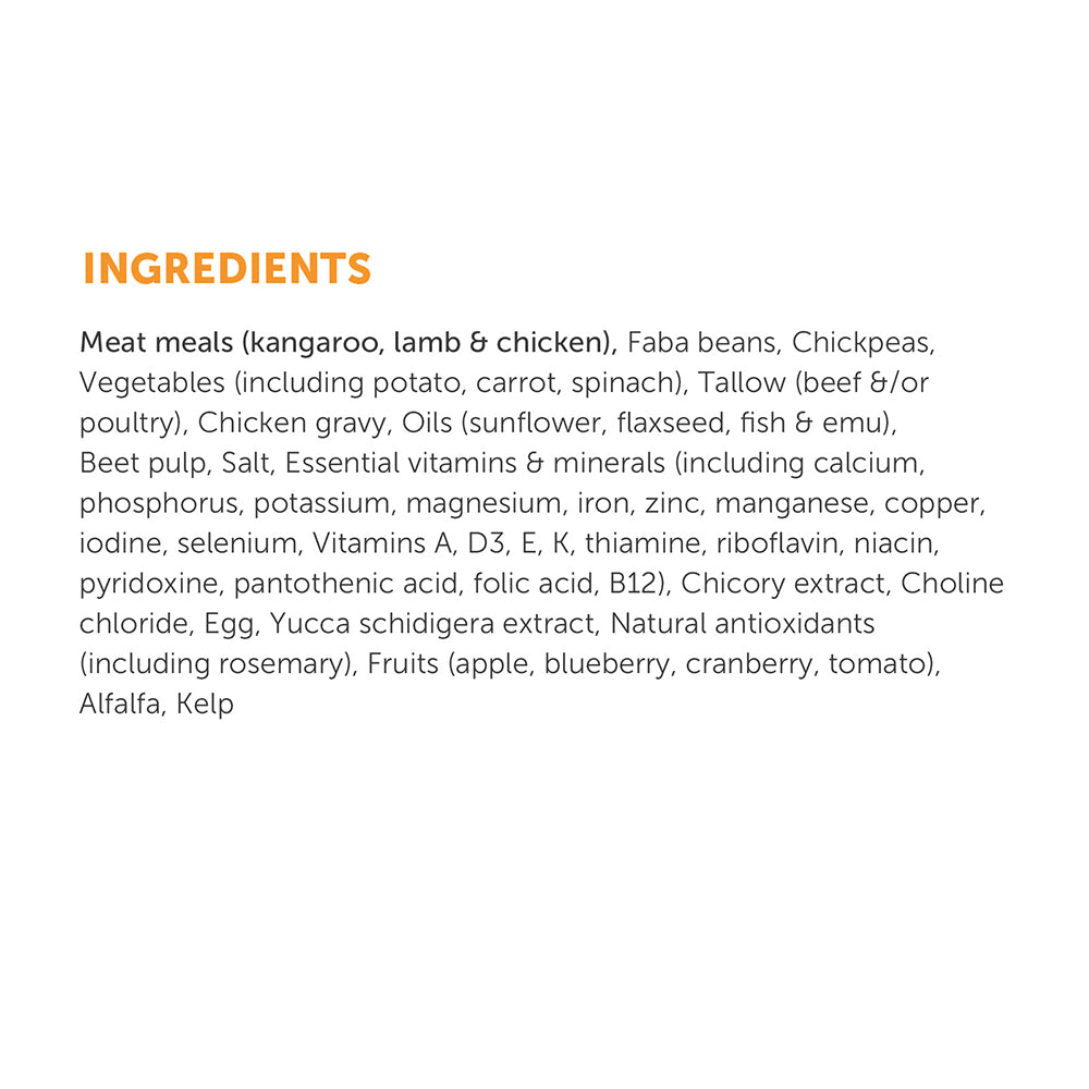 Meat meals (kangaroo, lamb & chicken), Faba beans, Chickpeas, Vegetables (including potato, carrot, spinach), Tallow (beef &/or poultry), Chicken gravy, Oils (sunflower, flaxseed, fish & emu), Beet pulp, Salt, Essential vitamins & minerals (including calcium, phosphorus, potassium, magnesium, iron, zinc, manganese, copper, iodine, selenium, Vitamins A, D3, E, K, thiamine, riboflavin, niacin, pyridoxine, panothenic acid, folic acid, B12), Chicory extract, Choline chloride, Egg, Yucca schidegera extract, Natural antioxidants (including rosemary), Fruits (apple, blueberry, cranberry, tomato), Alfalfa, Kelp.