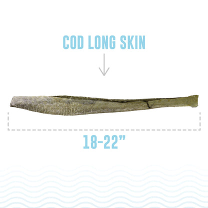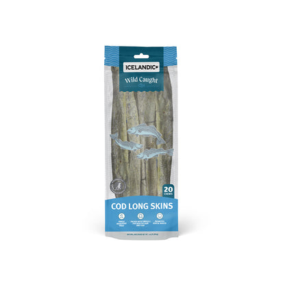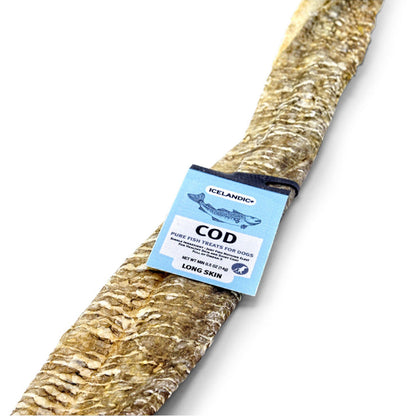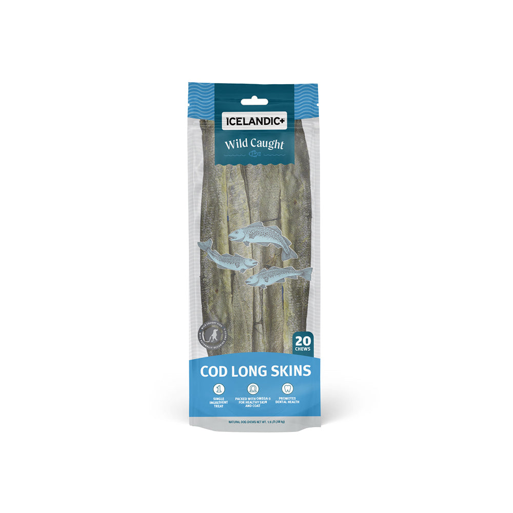 Our 100% natural and edible Icelandic Cod Long Skin Fish Sticks are single ingredient and contain no additives, preservatives, or supplements. The Cod Long Skins are 18-22" long and weight an average of 1-oz each. They come only from the pure icy waters of Iceland and are line-caught daily and processed immediately. Not only are they delicious for your dog, they reduce tartar and plaque build-up for healthier gums and teeth. They are also a great natural source of Omega-3 & Omega-6 fatty acids, promoting healthy skin and coat for your pet. With just one ingredient, these tasty and healthy treats are perfect for dogs with protein sensitivities. Our natural and edible fish products offer peace of mind as they are cleaned and air-dried within FDA, USDA, EU, and MAST standards and regulations. Because Iceland almost never gets warm, our fish always remain cold after being caught. As a result, they have less smell than other fish treats in the market.