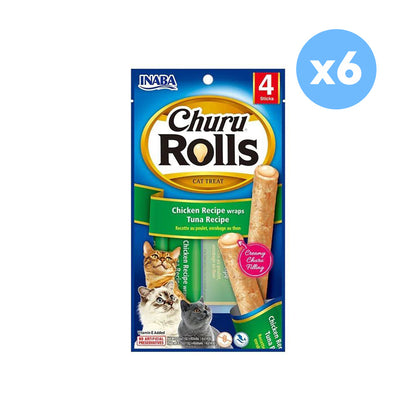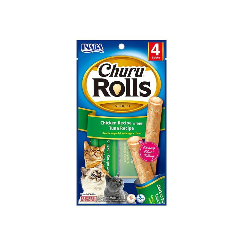 INABA Churu Rolls Chicken Recipe wraps Tuna Recipe are soft stick-shaped natural chicken treats seasoned with natural flavours, green tea extract and vitamin E. No grains, preservatives or artificial colours. Each package includes four individual treat packs to maintain maximum freshness.