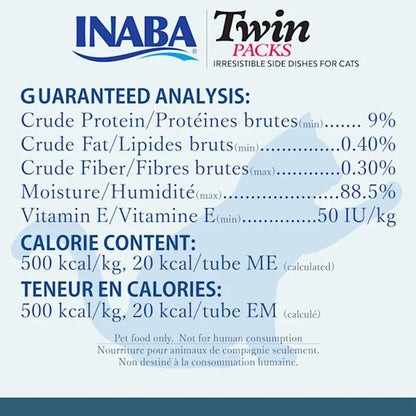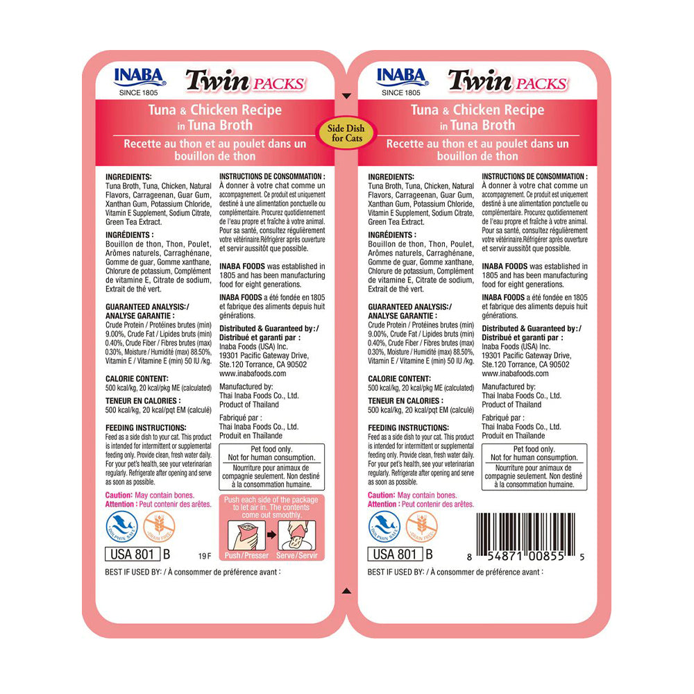 INABA Twin Packs Tuna with Chicken in Tuna Flavored Broth Cat Treats is a natural, high-quality snack for cats. Made with 100% pure chicken breast meat and wild tuna, it contains no grains, preservatives or artificial colours. The shredded tuna and chicken flakes drenched in savoury tuna broth gelée offer a unique texture that cats will love. With high moisture content and low calories, CIAO cat treats provide a healthy and delicious option for weight-conscious cats. Each Twin Pack contains two 40g pouches, making it convenient to serve and store.