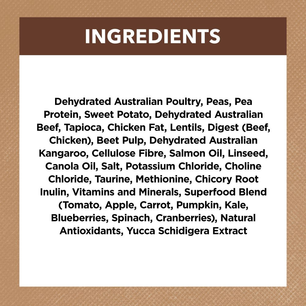 Dehydrated Australian Poultry, Peas, Pea Protein, Sweet Potato, Dehydrated Australian Beef, Tapioca, Chicken Fat, Lentils, Digest (Beef, Chicken), Beet Pulp, Dehydrated Australian Kangaroo, Cellulose Fibre, Salmon Oil, Linseed, Canola Oil, Salt, Potassium Chloride, Choline Chloride, Taurine, Methionine, Chicory Root Inulin, Vitamins and Minerals, Superfood Blend (Tomato, Apple, Carrot, Pumpkin, Kale, Blueberries, Spinach, Cranberries), Natural Antioxidants, Yucca Schidigera Extract.