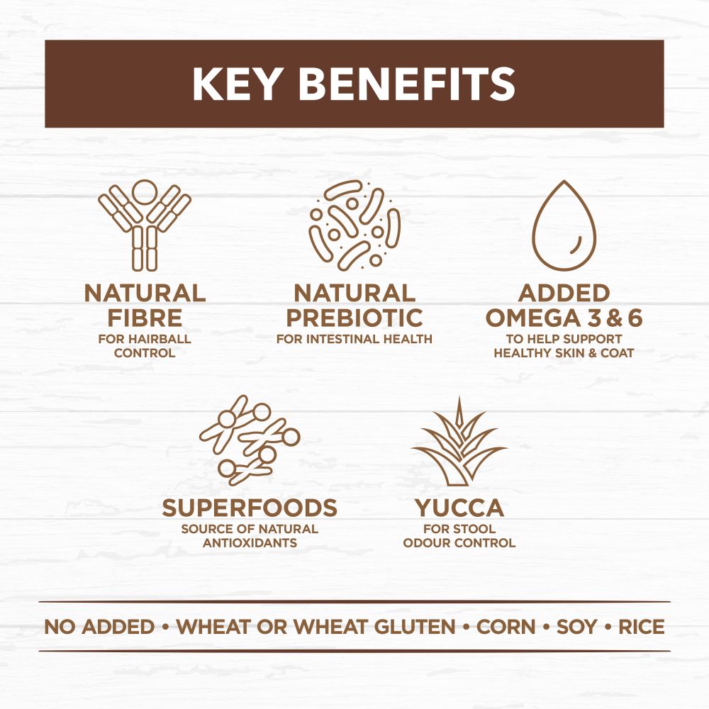 - Use of carefully selected ingredients to provide natural sources of grain-free complex carbohydrates and fibre to help support a healthy gut.
