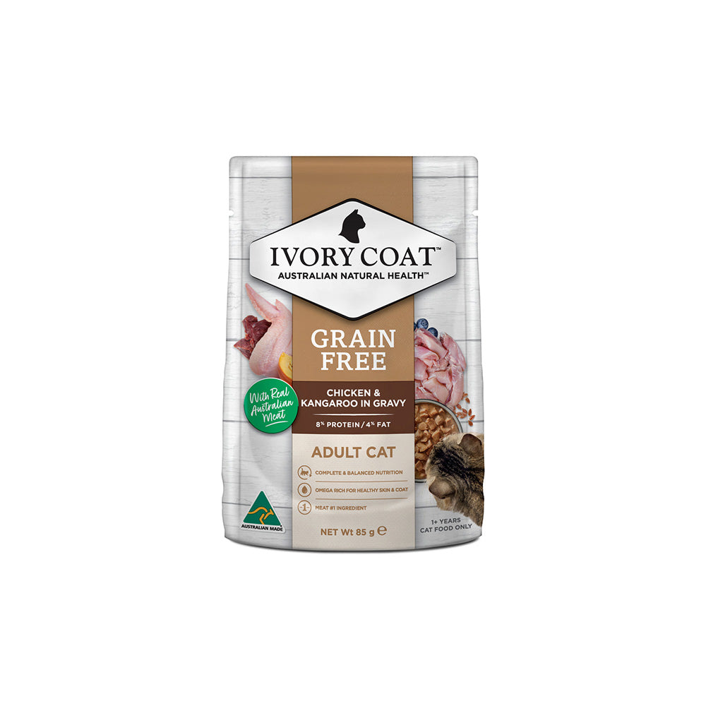 Ivory Coat uses wholesome, quality ingredients sourced directly in Australia. For an agile active cat, lean muscle and health maintenance are very important. That’s why IVORY COAT Chicken & Roo Gravy Cat Food for Adults 12x85g contains a high concentration of lean chicken protein for muscle health and Roo for iron, zinc, and other minerals. This superior formula is grain-free, ensuring trouble-free digestion and high absorption of important nutrients. Happiness is a well-fed cat!