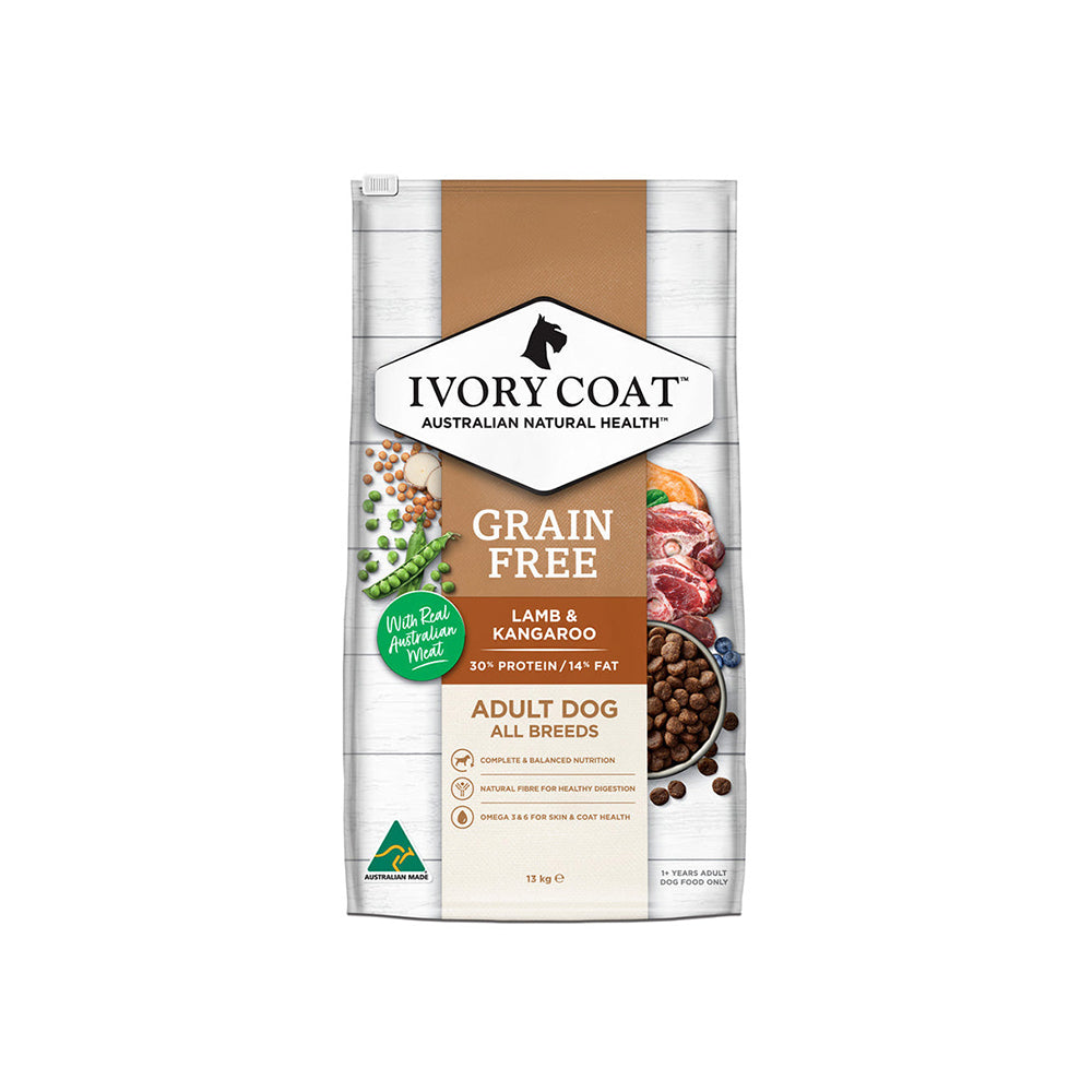 IVORY COAT Lamb & Kangaroo Grain Free Dog Food for Adult Dogs 13kg aids in the prevention of anaemia. It contains precious, essential nutrients for your dog's health like vitamin B12 which gives them enough strength to cope with daily activities. Lamb contains B12 maintaining a sufficient amount of red blood cells in your dog’s body will help oxygen and nutrients throughout its body function well!
